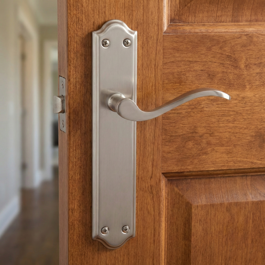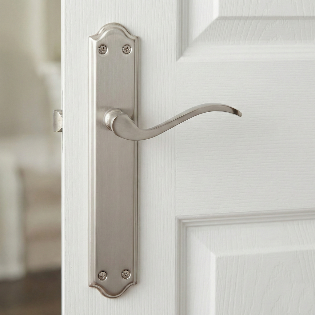 Handle set (1 handle for each side of the door) with curved oval plate for interior doors model 1101 in satin nickel finish. This original handle with four screws, two at the top and two at the bottom, follows an elegant and discreet line to install on the doors of your home. Renew your door handles at the best price. In addition, it includes all the accessories necessary for installation.