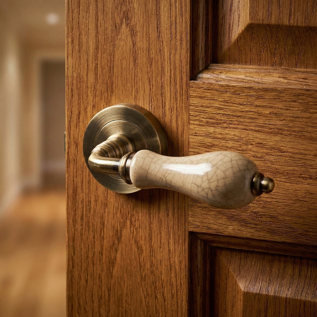 Handle set (2 handles for one door) in aluminum with round rosette in leather finish with porcelain for interior and passage doors. This avant-garde rosette is one of our most special models. Its porcelain-coated handle gives it a rustic touch and its leather finish makes it perfect to combine with all your doors. It follows a modern line that stylizes and is capable of adding elegance to any of your doors. It comes with all installation accessories included. What are you waiting for to renew your door handles?