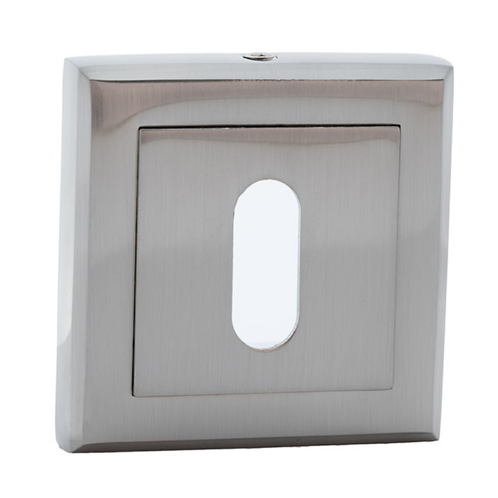- Bocallave cuadrada-cuadrada oval de zamak en acabado níquel satinado con las esquinas curvas.