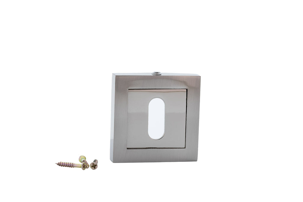 - Bocallave cuadrada-cuadrada oval de zamak en acabado níquel satinado y cromo brillo.