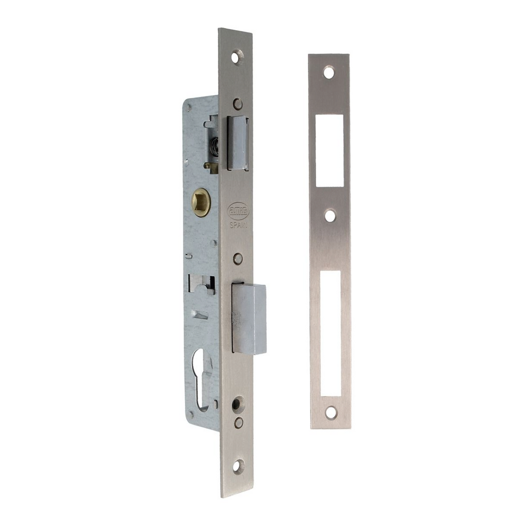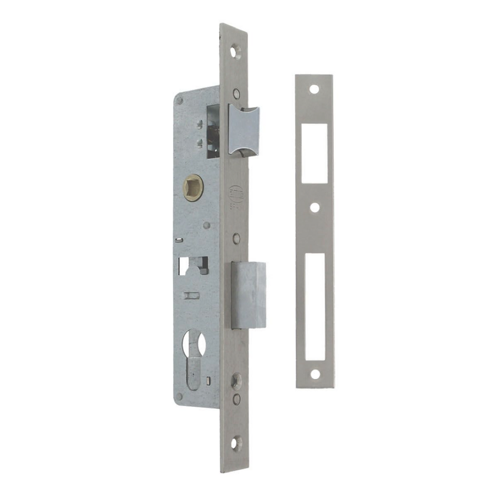 - Cerradura de canto recto de embutir para puertas metálicas con 85mm entre ejes y 20mm desde el perfil hasta la bocallave.