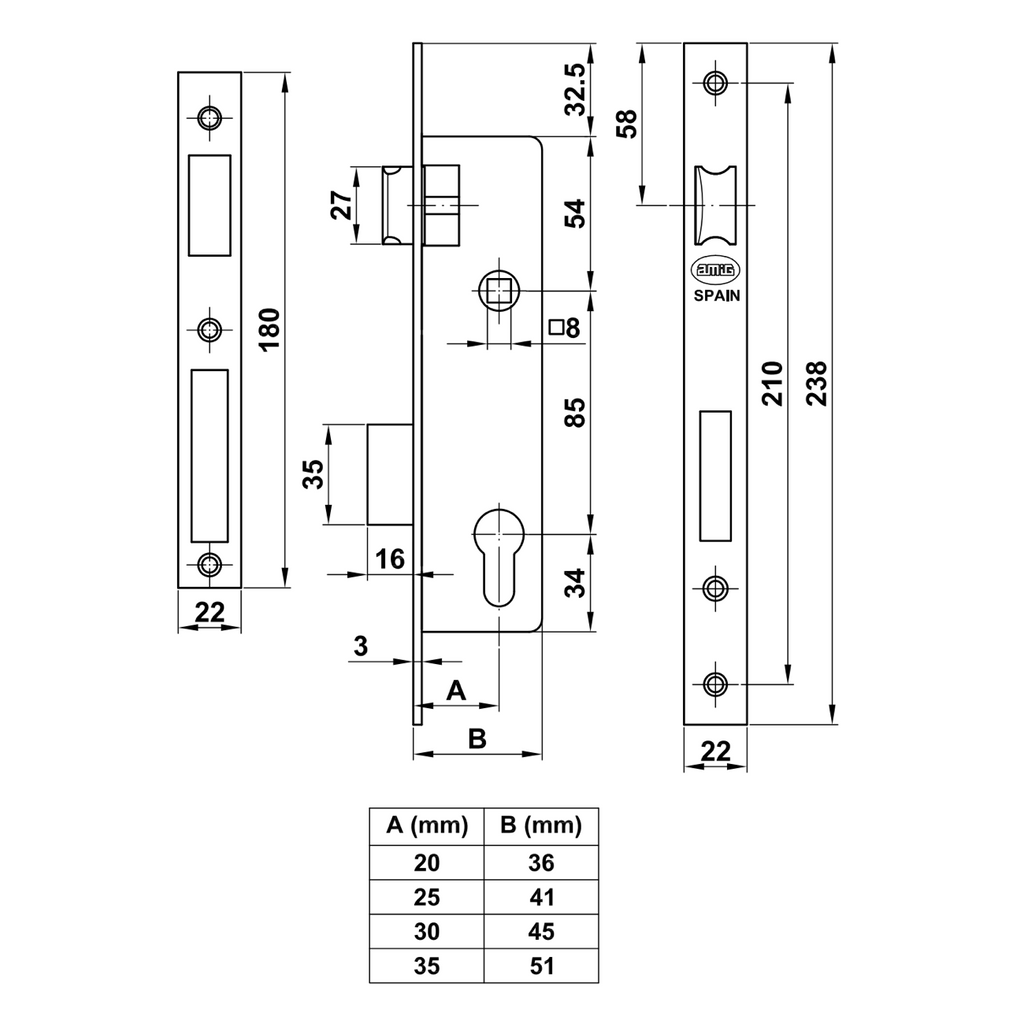 - Cerradura de canto recto de embutir para puertas metálicas con 85mm entre ejes y 30mm desde el perfil hasta la bocallave.