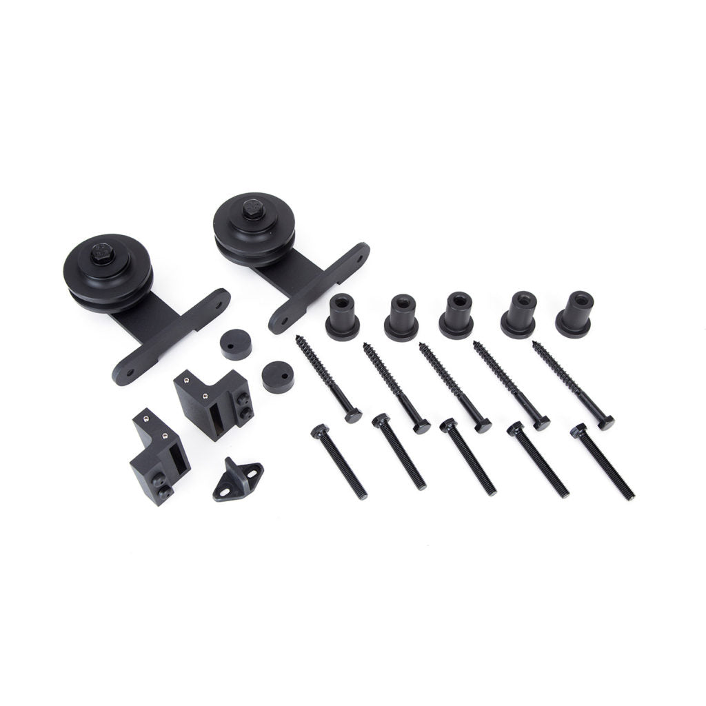 Este Kit en negro incluye todos los herrajes para instalar una puerta corredera de madera. El Kit es de acero: