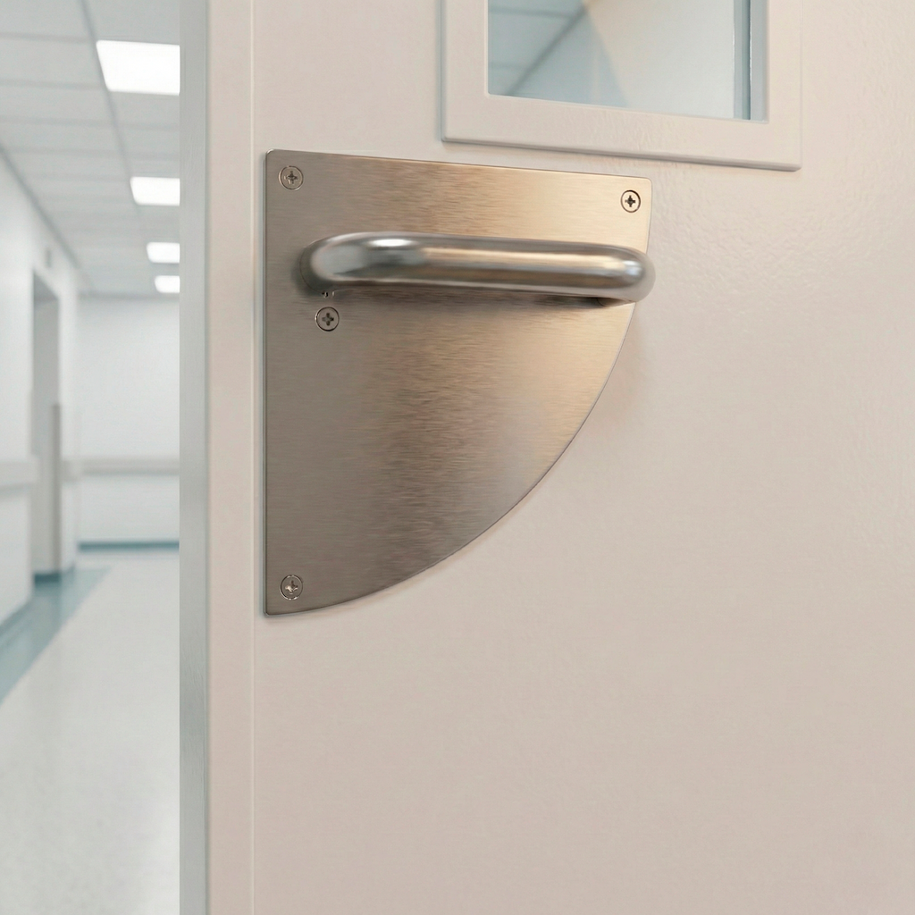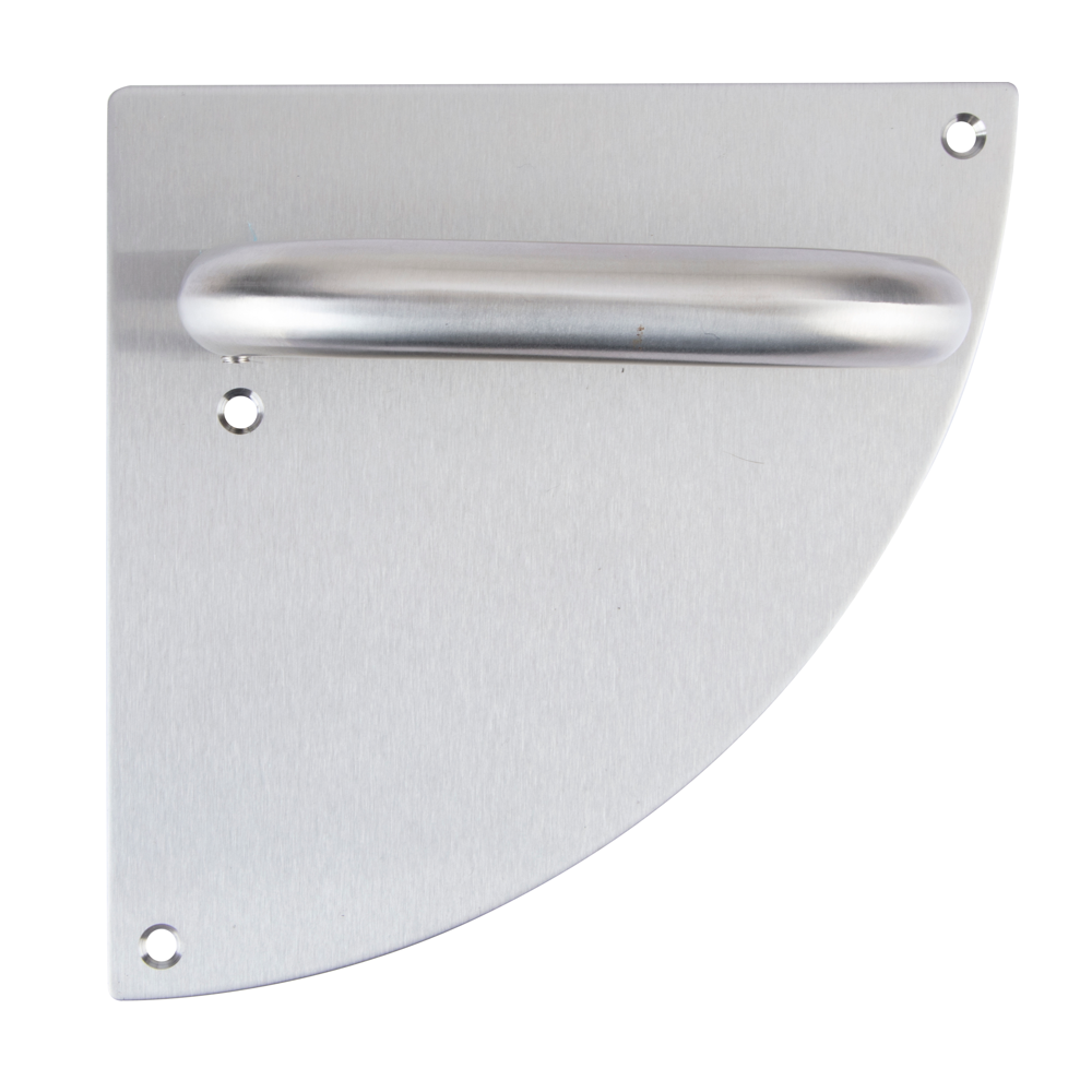 Juego de manillas (2 manillas; 1 manilla para cada lado de la puerta) con placa semicircular de acero inoxidable para puertas de interior y de exterior. Esta manilla es ideal para instalar en lugares públicos de gran intensidad de afluencia. Es una manilla de calidad, duradera y funcional. Además, viene con todos los accesorios necesarios para su instalación.