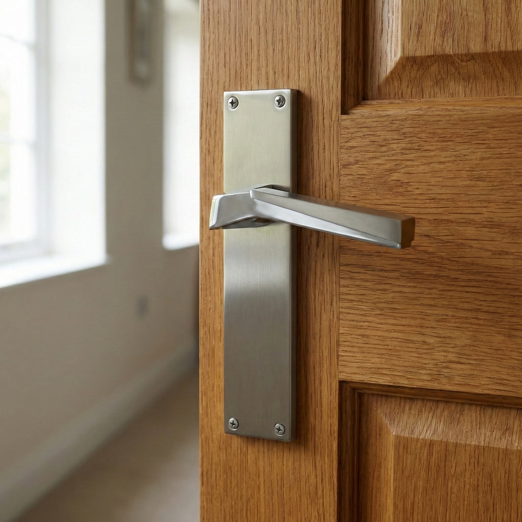 Juego de manillas (2 manillas; 1 manilla para cada lado de la puerta) con placa rectangular de zamak en acabado bicolor para puertas modelo 120. Esta manilla es de gran calidad, con un diseño ideal para tus puertas. Además, su material la permite soportar una gran intensidad de uso.