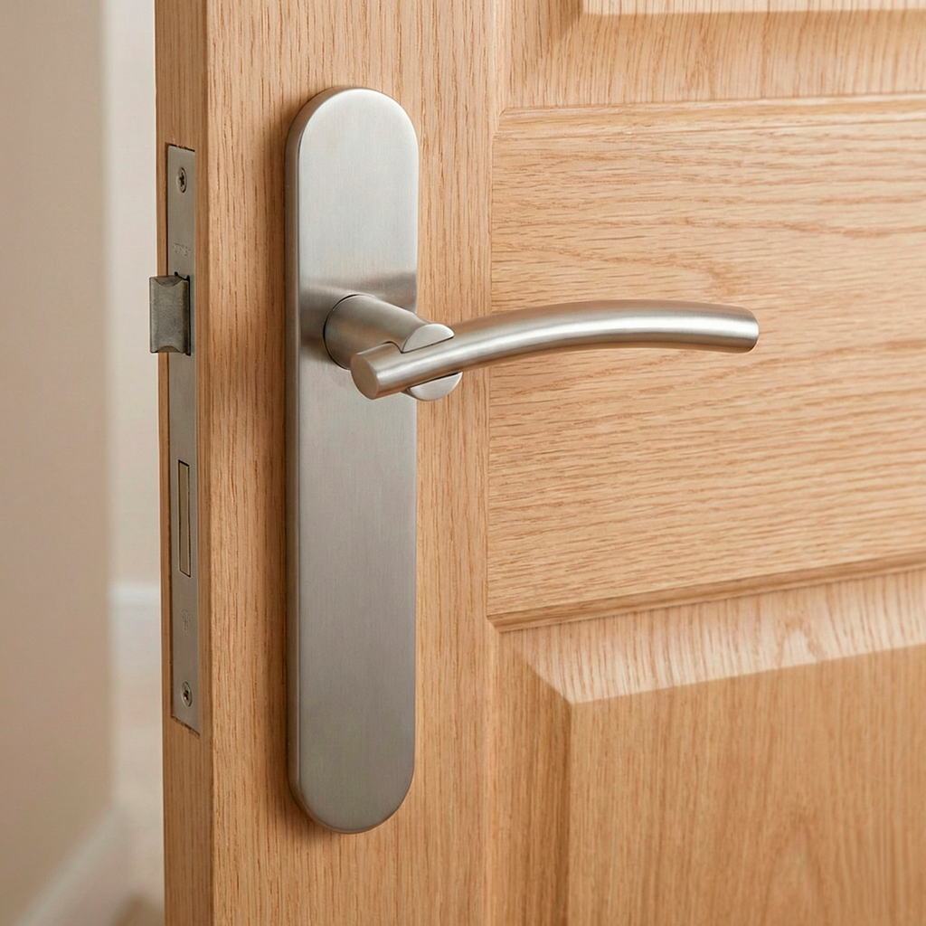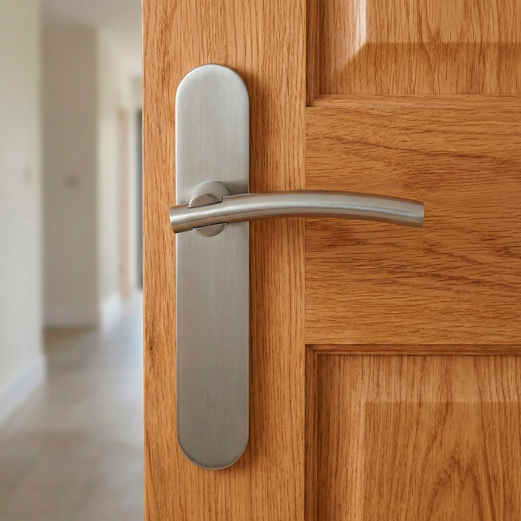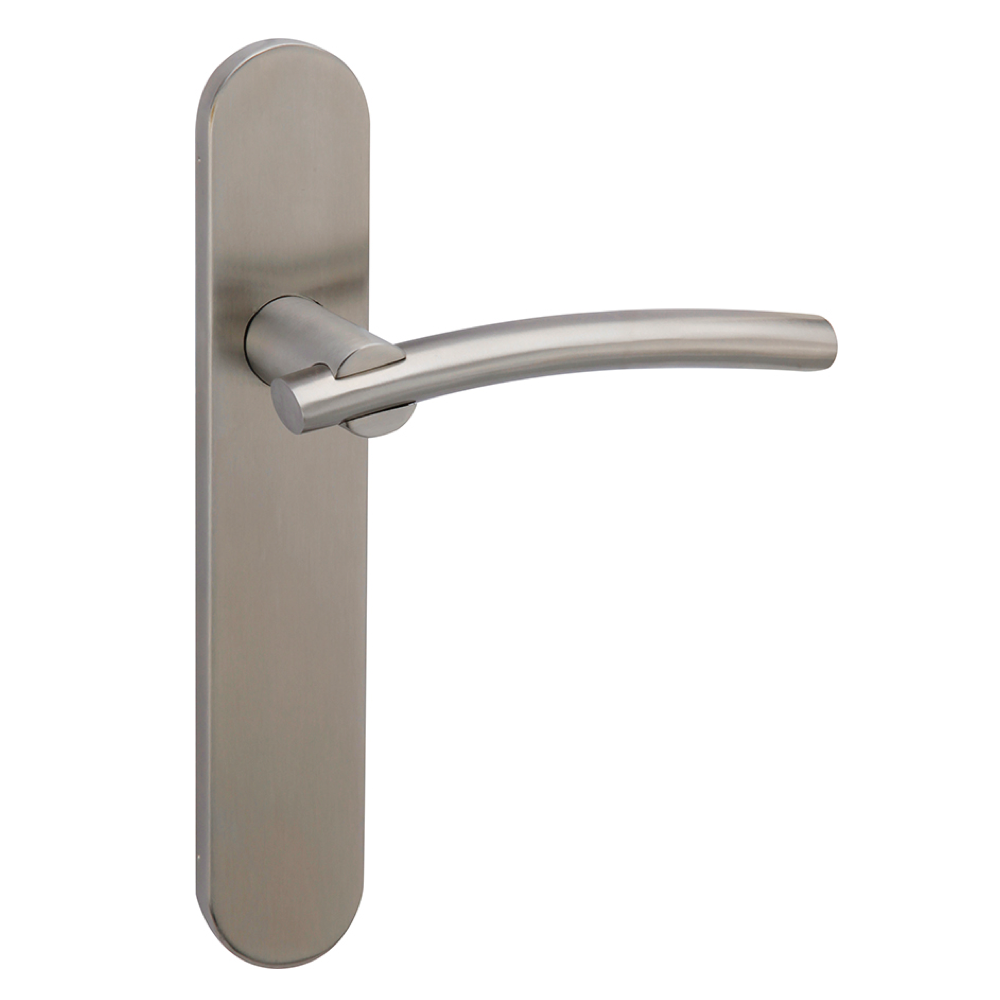 Juego de manillas (2 manillas; 1 manilla para cada lado de la puerta) con placa ovalada de acero inoxidable para puertas de interior y de exterior modelo 2035. Esta elegante y vanguardista manilla con diseño estirado y estilista es ideal para aportar un toque moderno y decorativa a las puertas de tu hogar. Tiene tornillos ocultos y un diseño de asa original. Además, es un material resistente capaz de soportar gran intensidad de uso.