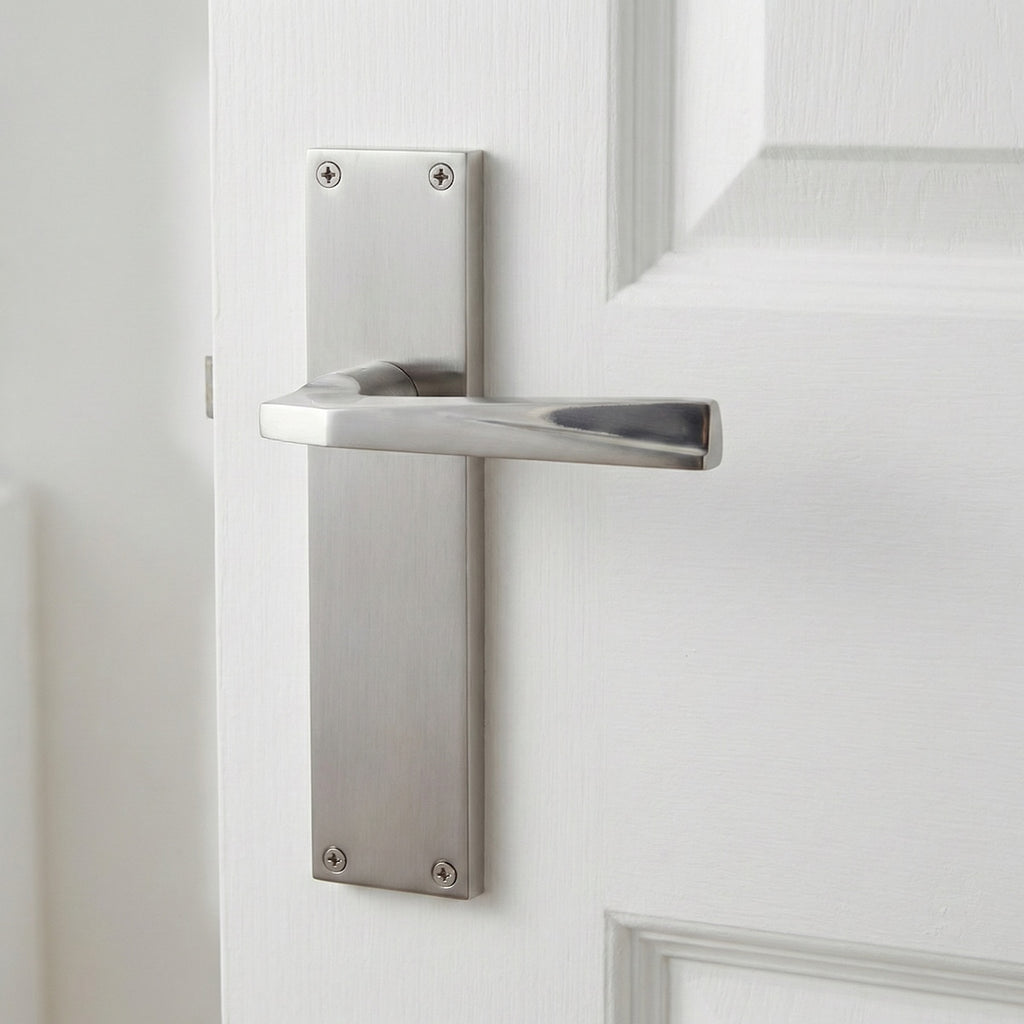 Juego de manillas (2 manillas; 1 manilla para cada lado de la puerta) con placa rectangular de zamak en acabado níquel satinado para puertas de interior modelo 208. Esta manilla de diseño vanguardista y elegante, es ideal para las puertas de tu hogar aportando un toque de luz de amplitud. Viene con todos los accesorios necesarios para su instalación.