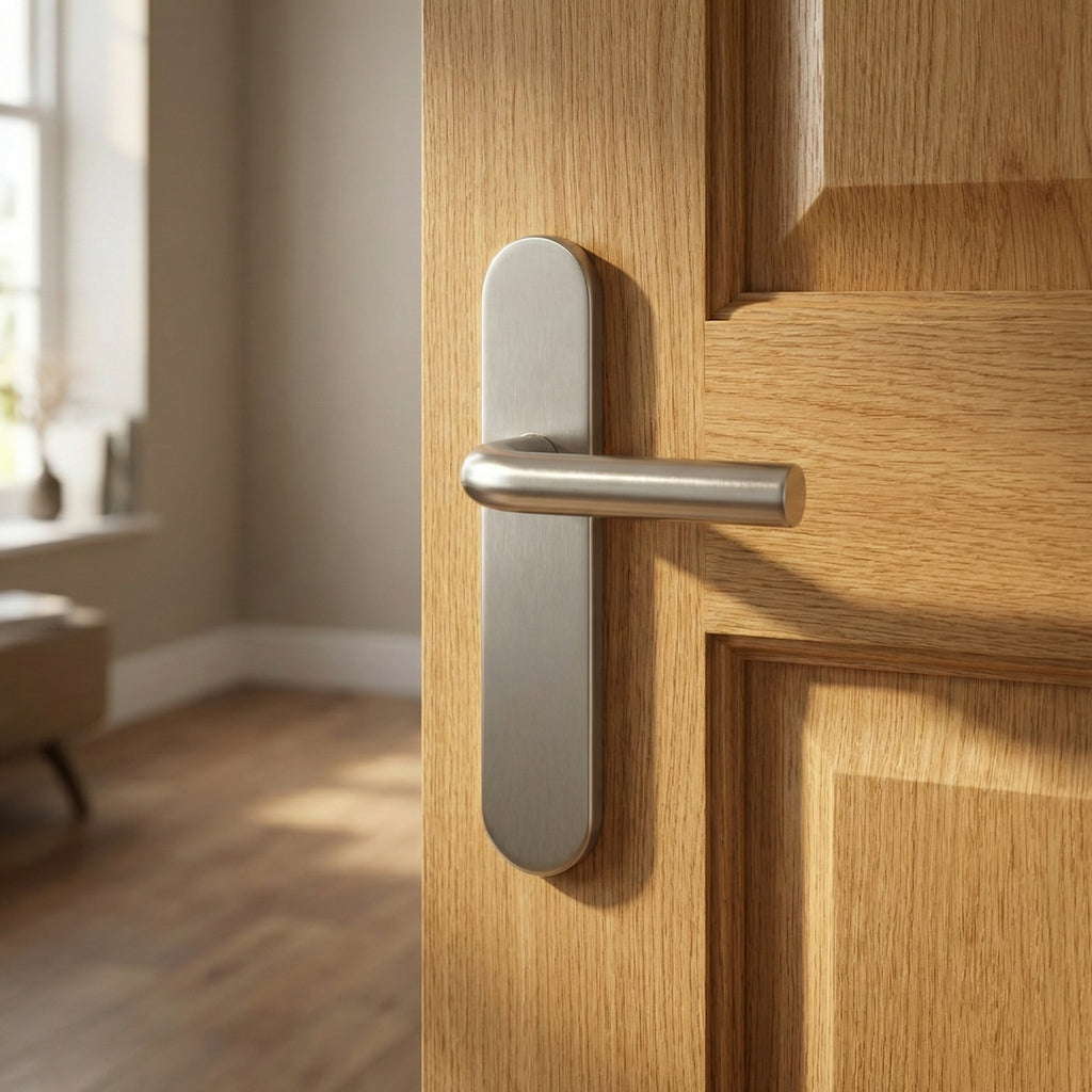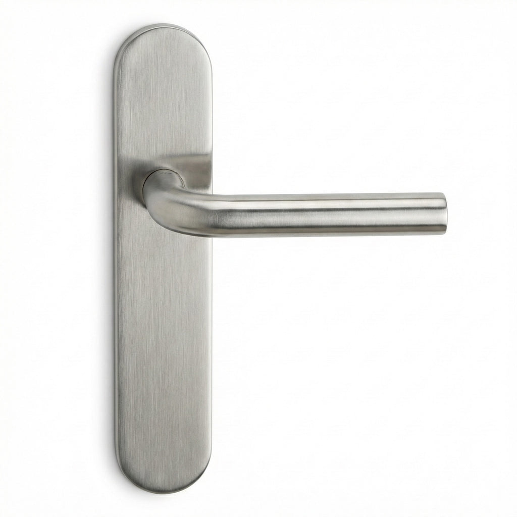 Juego de manillas (2 manillas; 1 manilla para cada lado de la puerta) con placa ovalada y asa curva de acero inoxidable con tornillos ocultos para puertas de interior y de exterior modelo 403. Este juego de manillas de acero inoxidable para puertas, es un modelo clásico, muy elegante e ideal para vestir cualquier puerta aportando un toque de calidad. Además, viene con todos los accesorios necesarios para su instalación por lo que ¿A qué esperas para renovar las manillas de tus puertas?