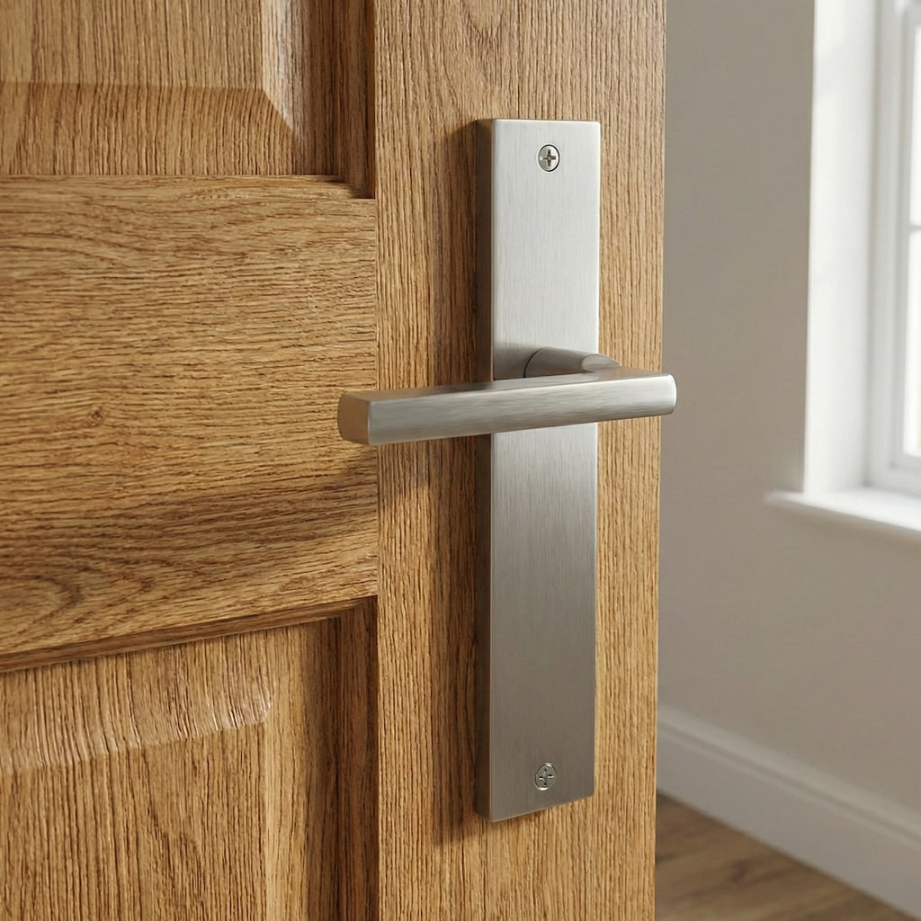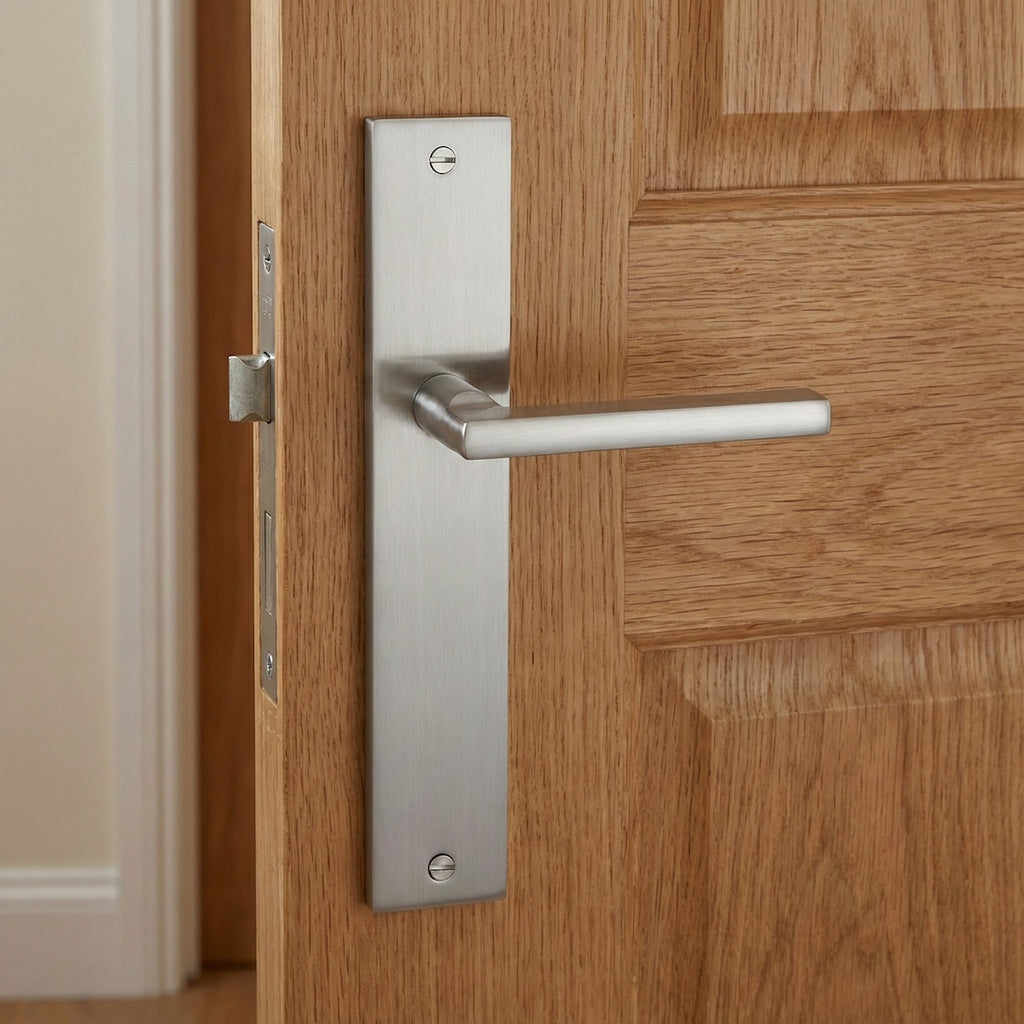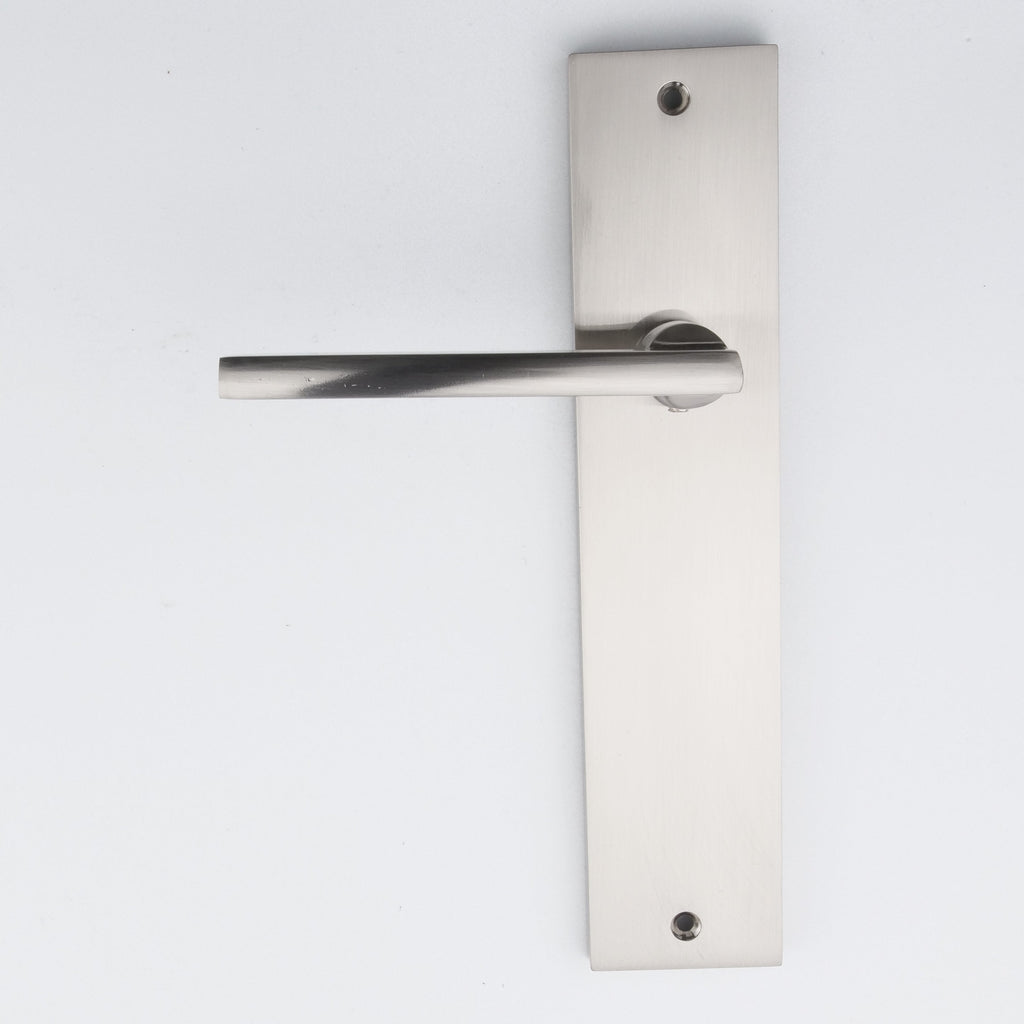 Juego de manillas (1 manilla para cada lado de la puerta) rental con placa rectangular en acabado níquel satinado de zamak para puertas de interior. Este clásico juego de manillas sigue una linea básica y austera pero ideal para instalar en cualquier puerta. Es uno de los modelo más vendidos y además viene con todos los accesorios necesarios para su instalación por lo que ¿A qué esperas para cambiar las manillas de tus puertas?