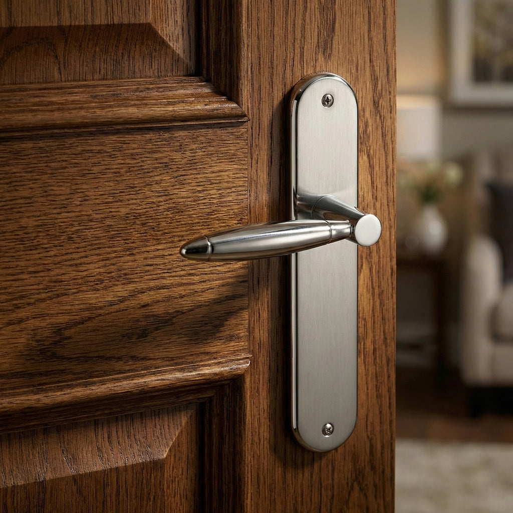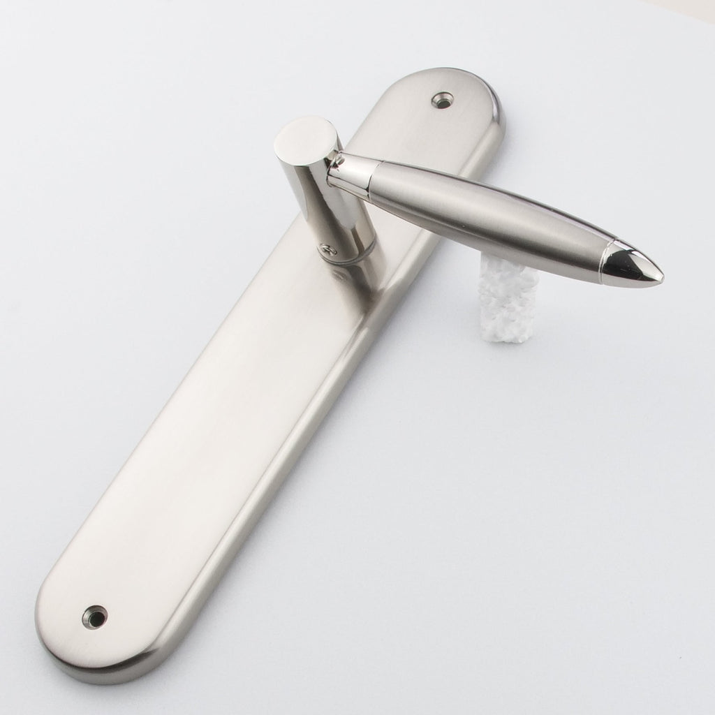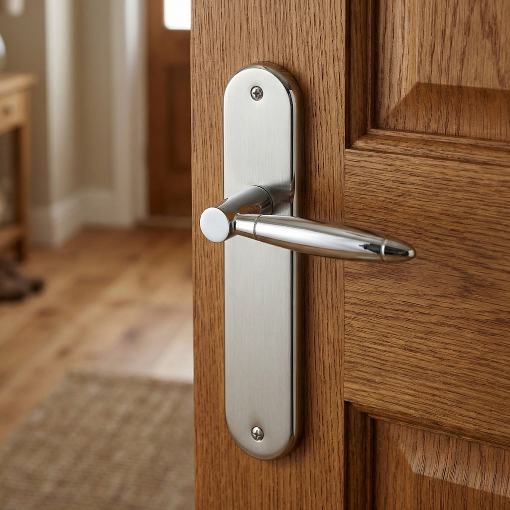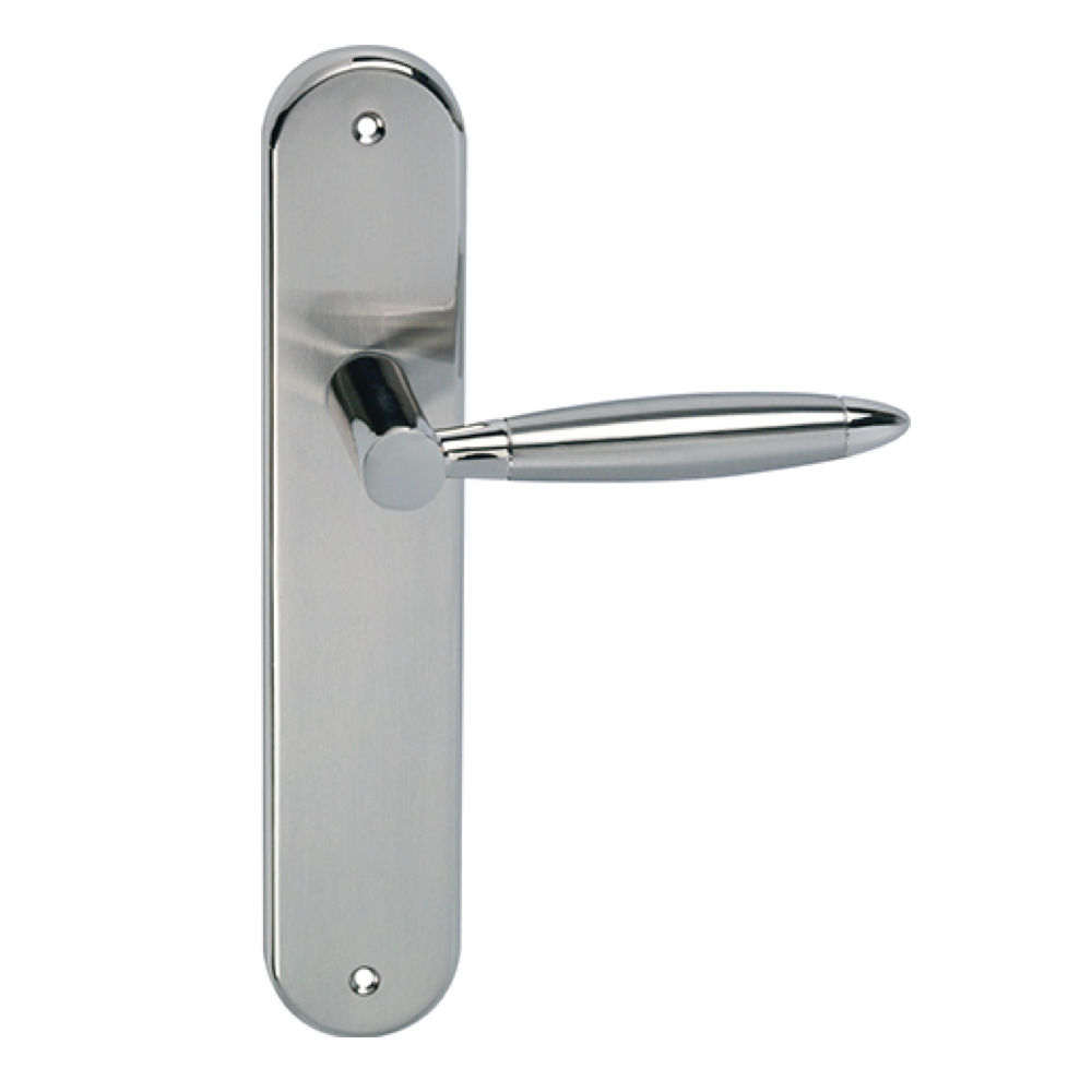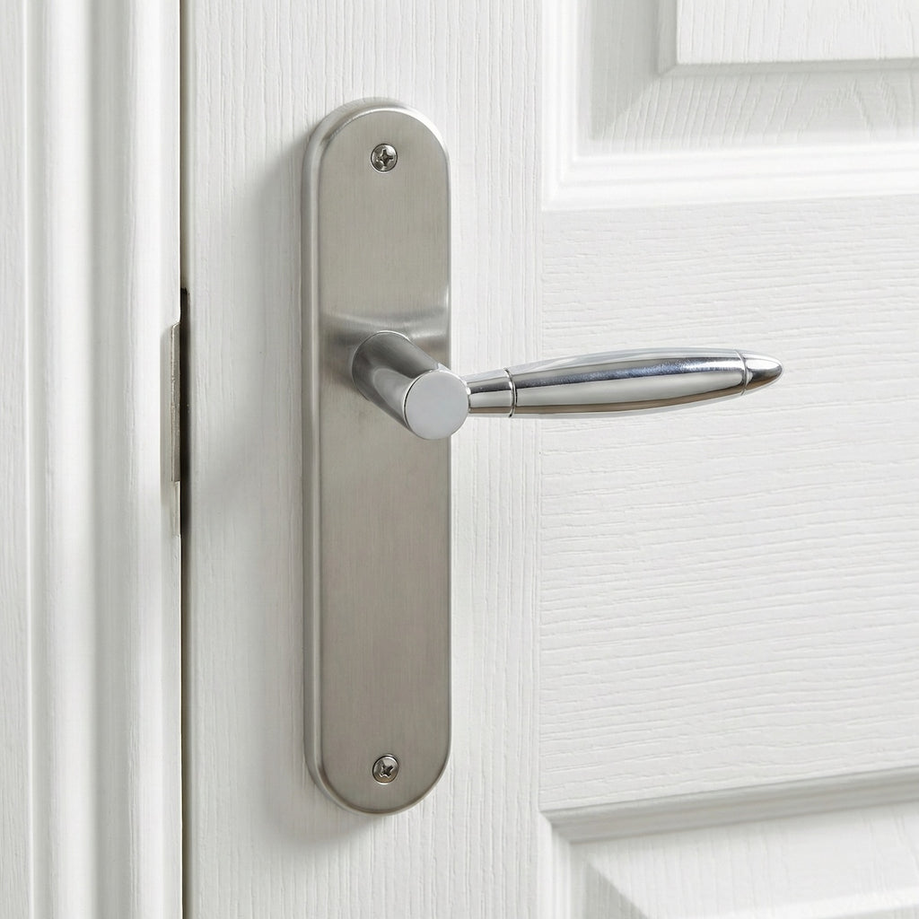 Juego de manillas (2 manillas; 1 manilla para cada lado de la puerta) con placa ovalada de zamak en acabado bicolor para puertas de interior modelo 630. Esta manilla de diseño vanguardista y elegante, es ideal para las puertas de tu hogar aportando un toque de luz y de amplitud. Viene con todos los accesorios necesarios para su instalación.