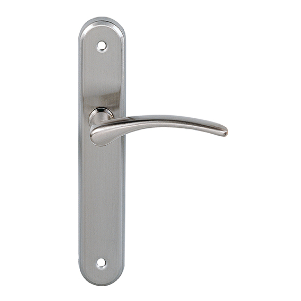 Juego de manillas (1 manilla para cada lado de la puerta) con placa ovalada de zamak en acabado níquel satinado para puertas modelo 6331. Esta manilla tiene un clásico diseño ideal para conjuntar con cualquier estilo de puerta. Además, viene con todos los accesorios necesarios para su instalación por lo que ¿A qué esperas para renovar las manillas de tus puertas?
