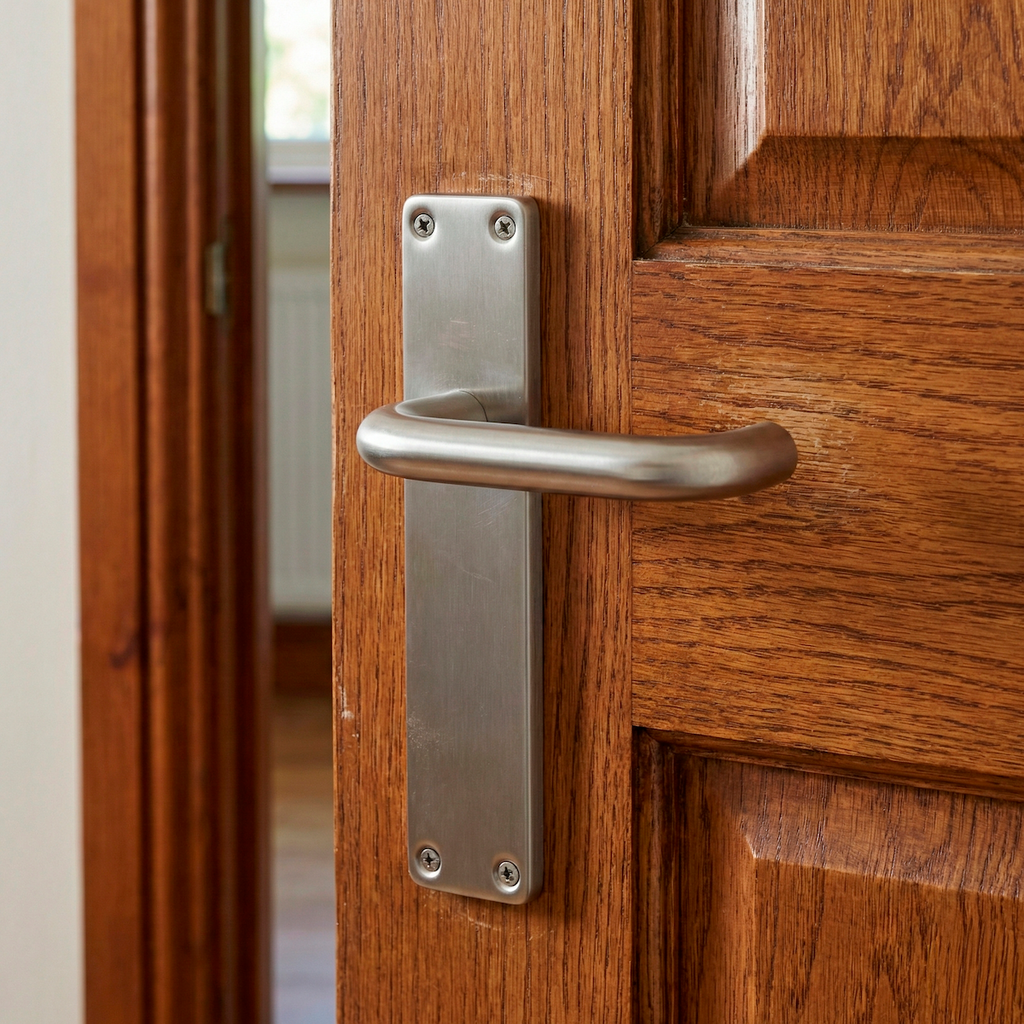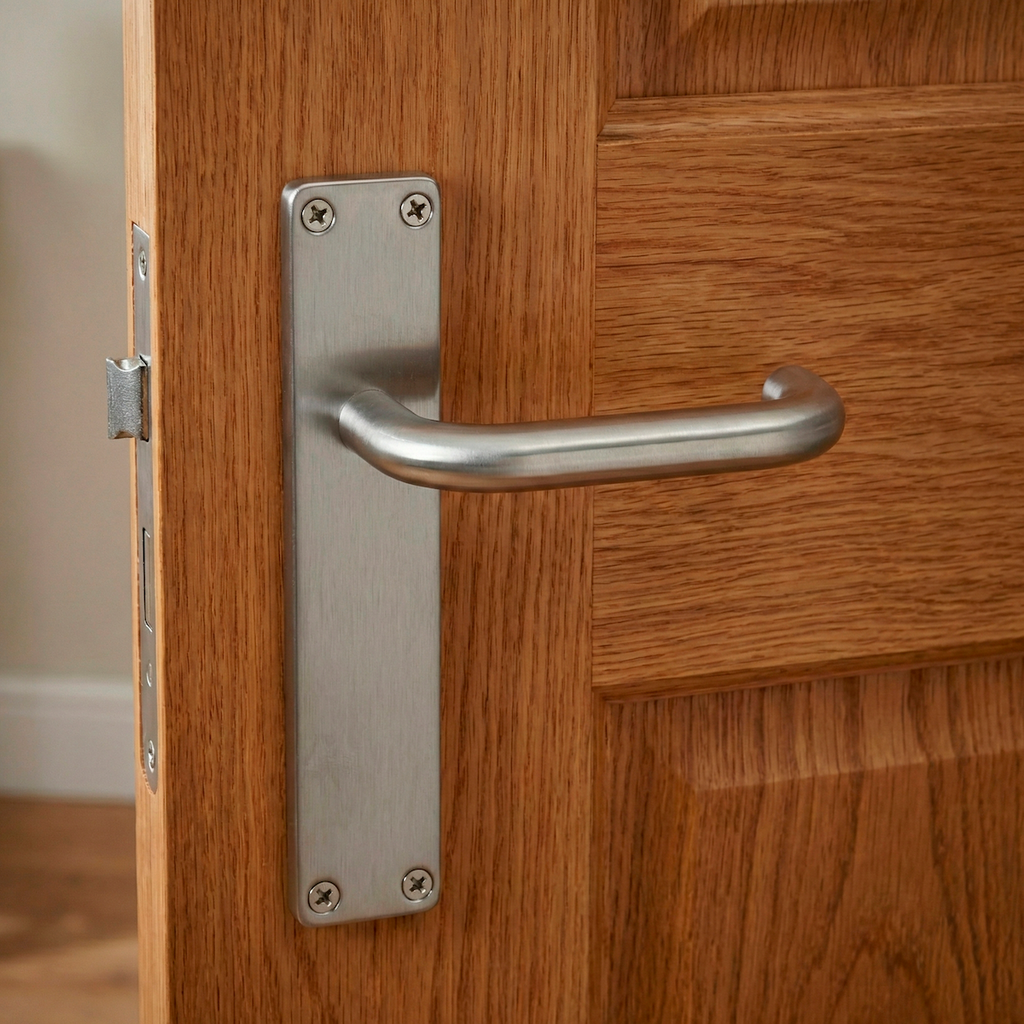 Juego de manillas (2 manillas; 1 manilla para cada lado de la puerta) con placa rectangular de acero inoxidable y asa curva para puertas de interior y exterior. Esta manilla de diseño sencillo y económica es ideal para vestir las puertas de tu hogar. Viene con todos los accesorios necesarios para su instalación.