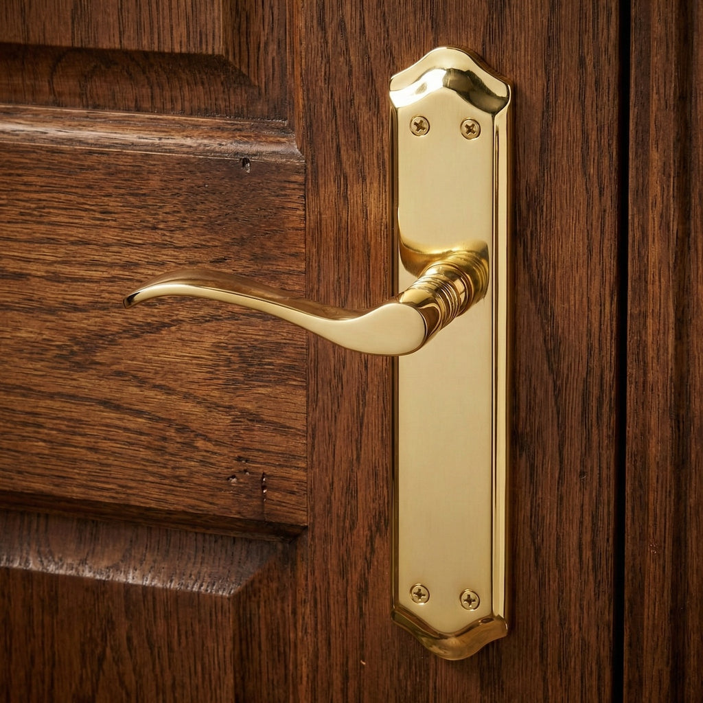 Juego de manillas (2 manillas; 1 para cada lado de la puerta) modelo 881 con placa ovalada curva de aluminio en acabado dorado satinado para puertas de interior ideal para tus puertas.