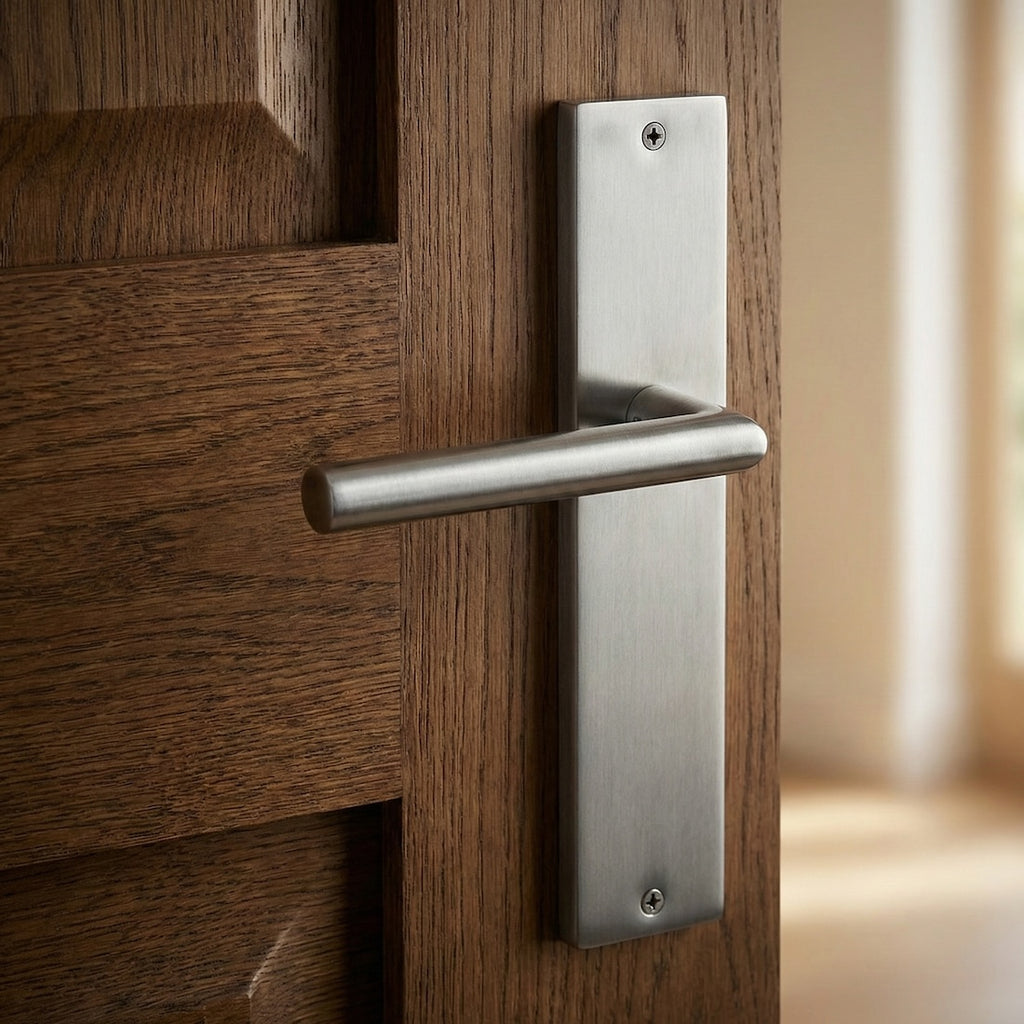 Juego de manillas (2 manillas; 1 manilla para cada lado de la puerta) con placa rectangular de acero inoxidable para puertas de interior y de exterior modelo 503. Esta manilla de diseño sencillo pero elegante, es ideal para las puertas de tu hogar. Viene con todos los accesorios necesarios para su instalación.