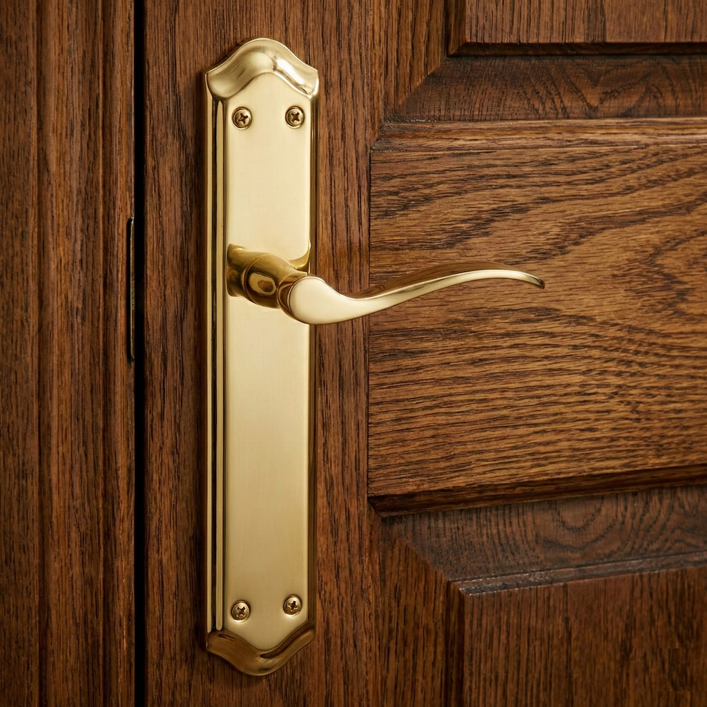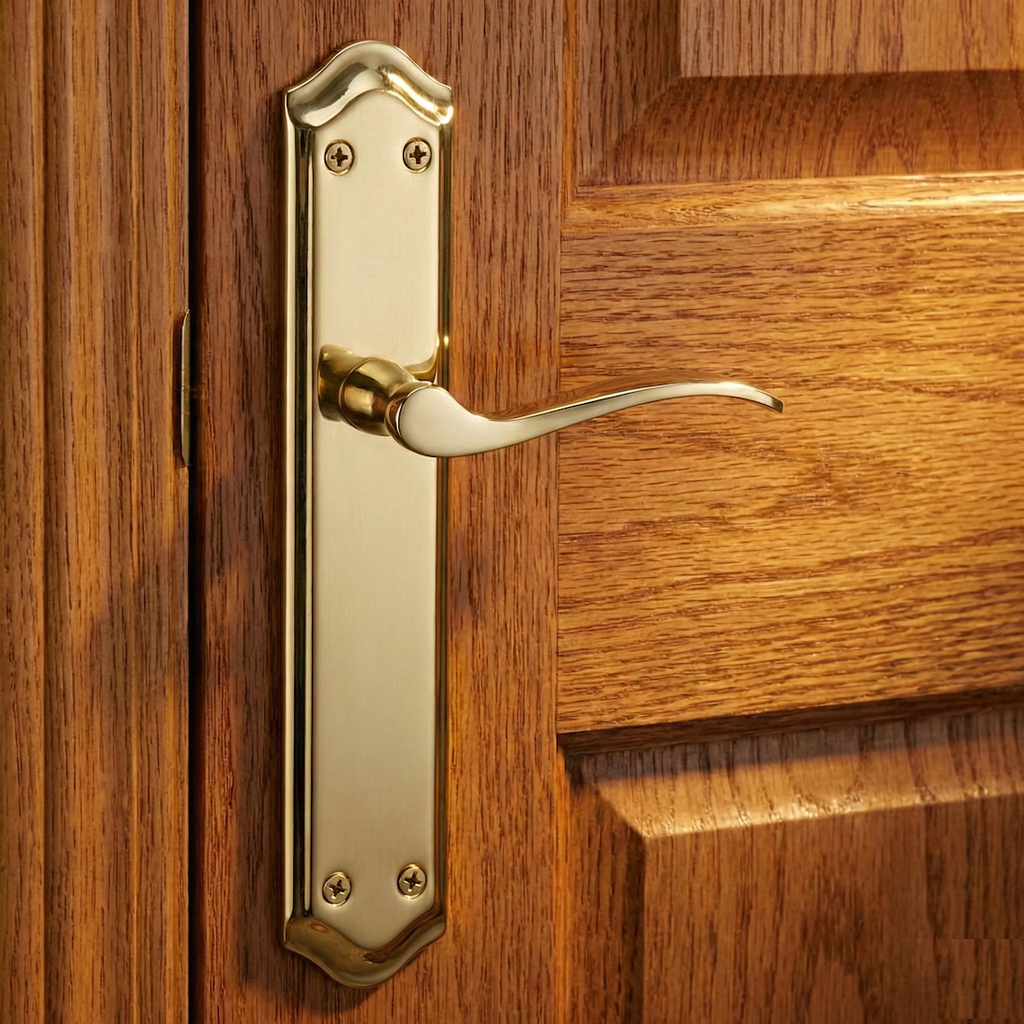 Juego de manillas (2 manillas; 1 para cada lado de la puerta) modelo MASTER con placa ovalada curva de aluminio en acabado dorado satinado para puertas de interior. Esta manilla con placa, aporta un toque de estética y elegancia a las puertas de tu casa. Sigue un diseño original ideal para instalar con cualquier tonalidad de puerta. Además, esta manilla con placa tiene un precio escandaloso por lo que... ¿A qué esperas para renovar las manillas de tus puertas?