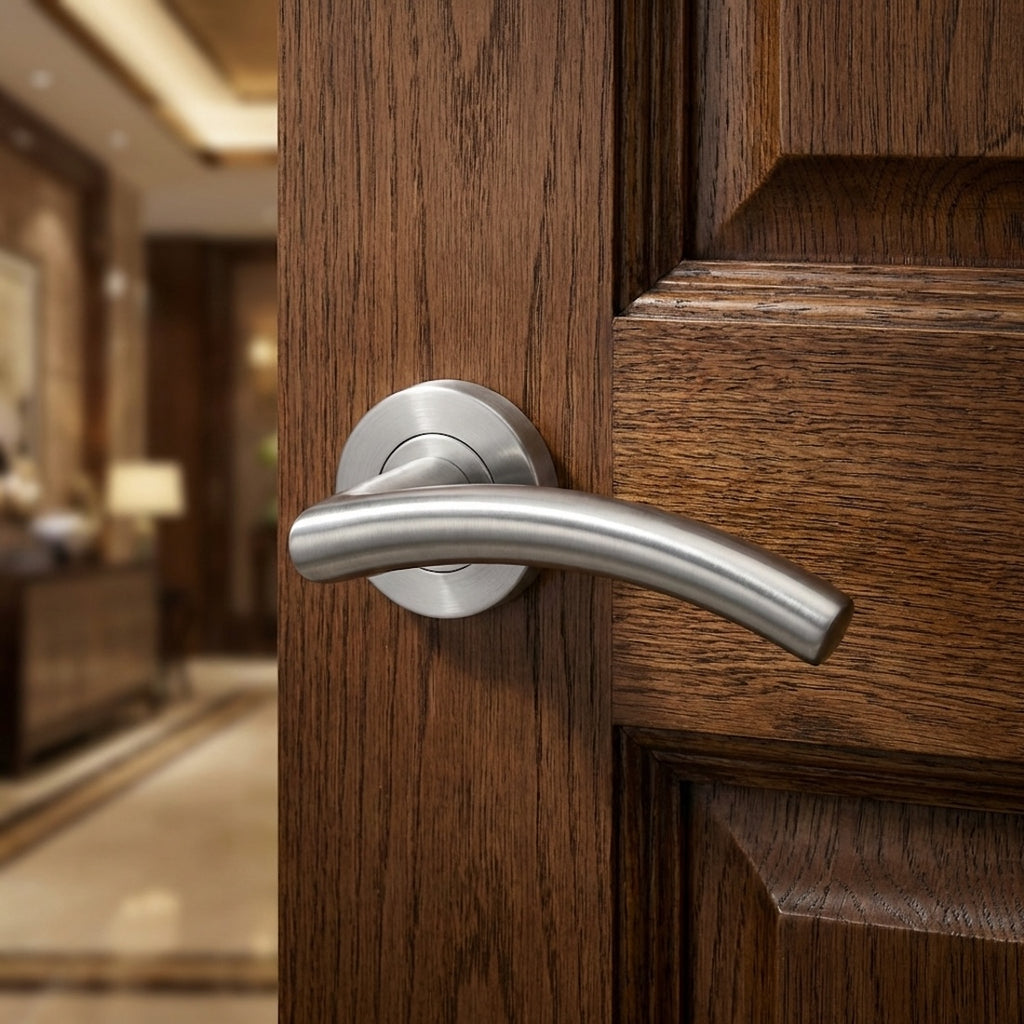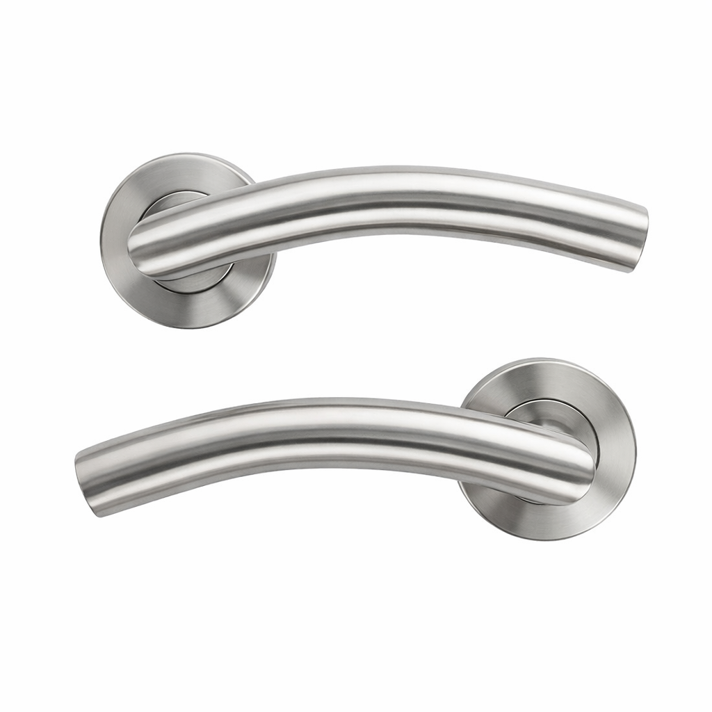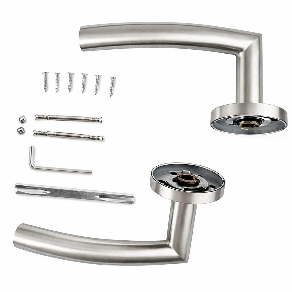Juego de manillas (2 manillas para una puerta) Nix tubulares con roseta redonda de acero inoxidable para puertas de interior y exterior. El material de esta manilla es acero inoxidable 304 preparado para convivir en ambientes exteriores y hacer frente a ambientes corrosivos. Su acabado es en inox y su diseño sigue una linea vanguardista y moderna para vestir tus puertas de manera elegante y dar sensación de novedad. Viene con todos los accesorios para la instalación incluidos.