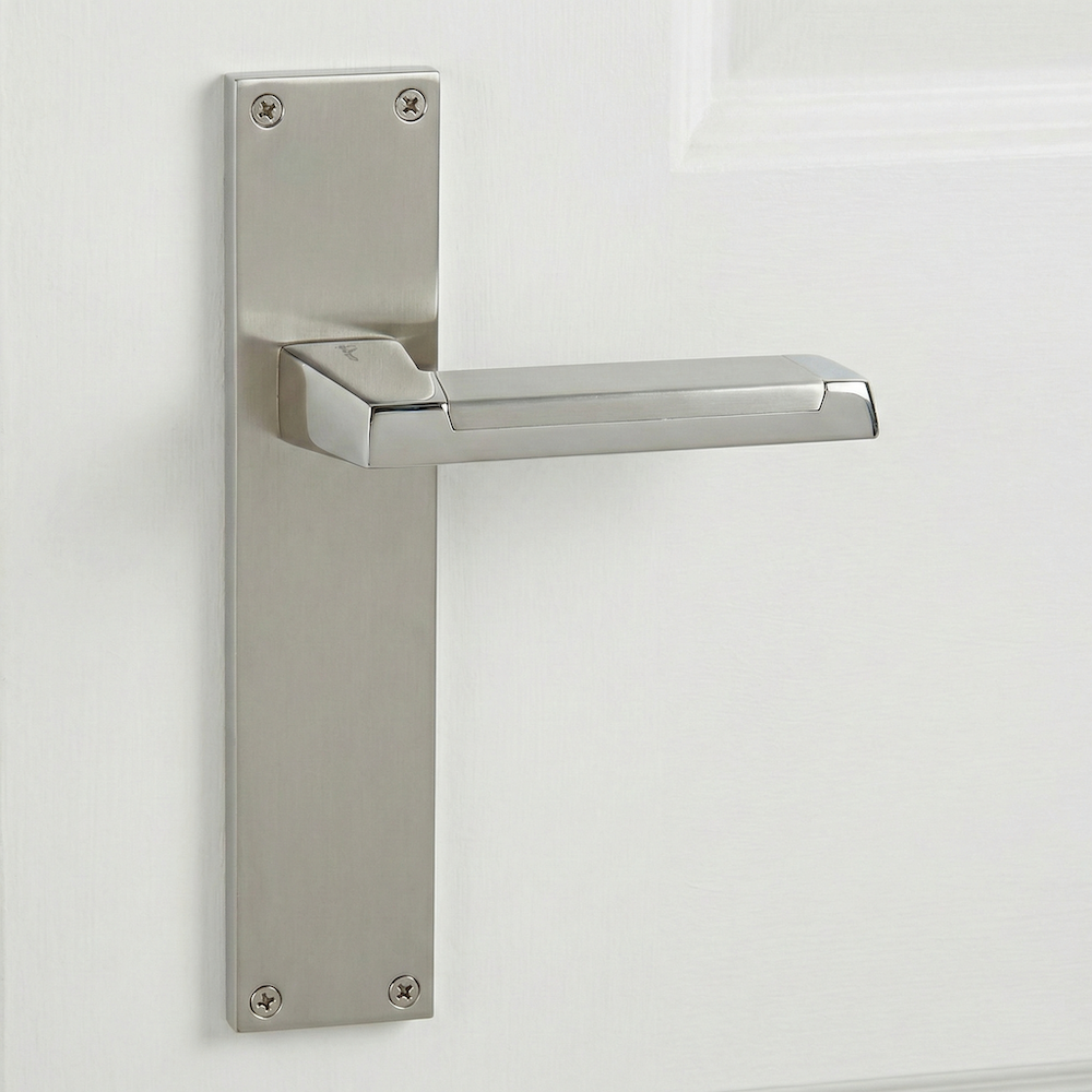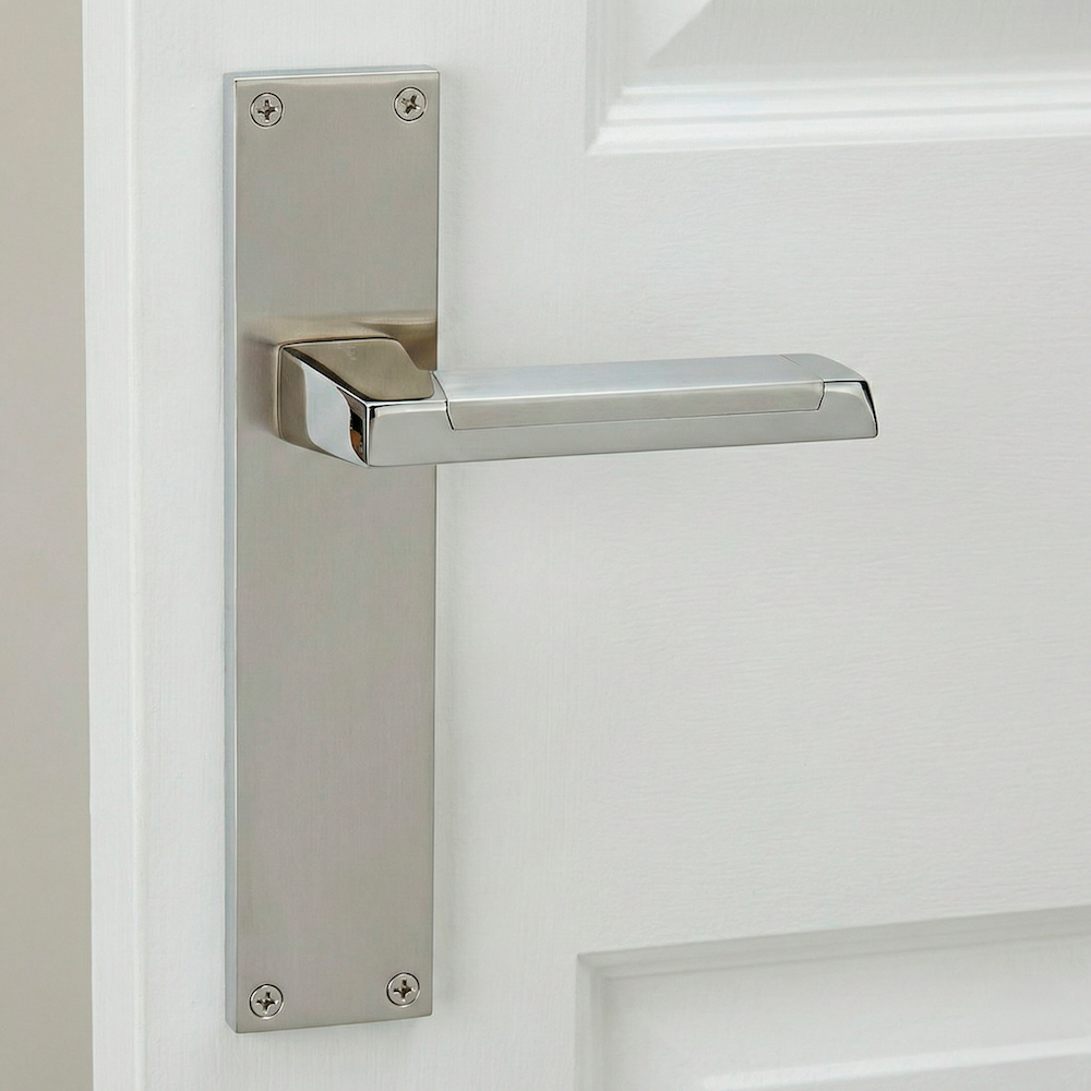 Juego de manillas (2 manillas; 1 manilla para cada lado de la puerta) con placa rectangular de zamak para puertas en acabado bicolor para puertas modelo 620. Esta elegante manilla con un diseño moderno es ideal para las puertas de tu hogar.