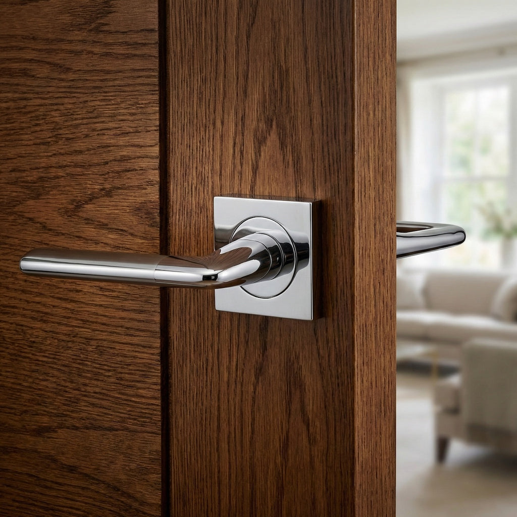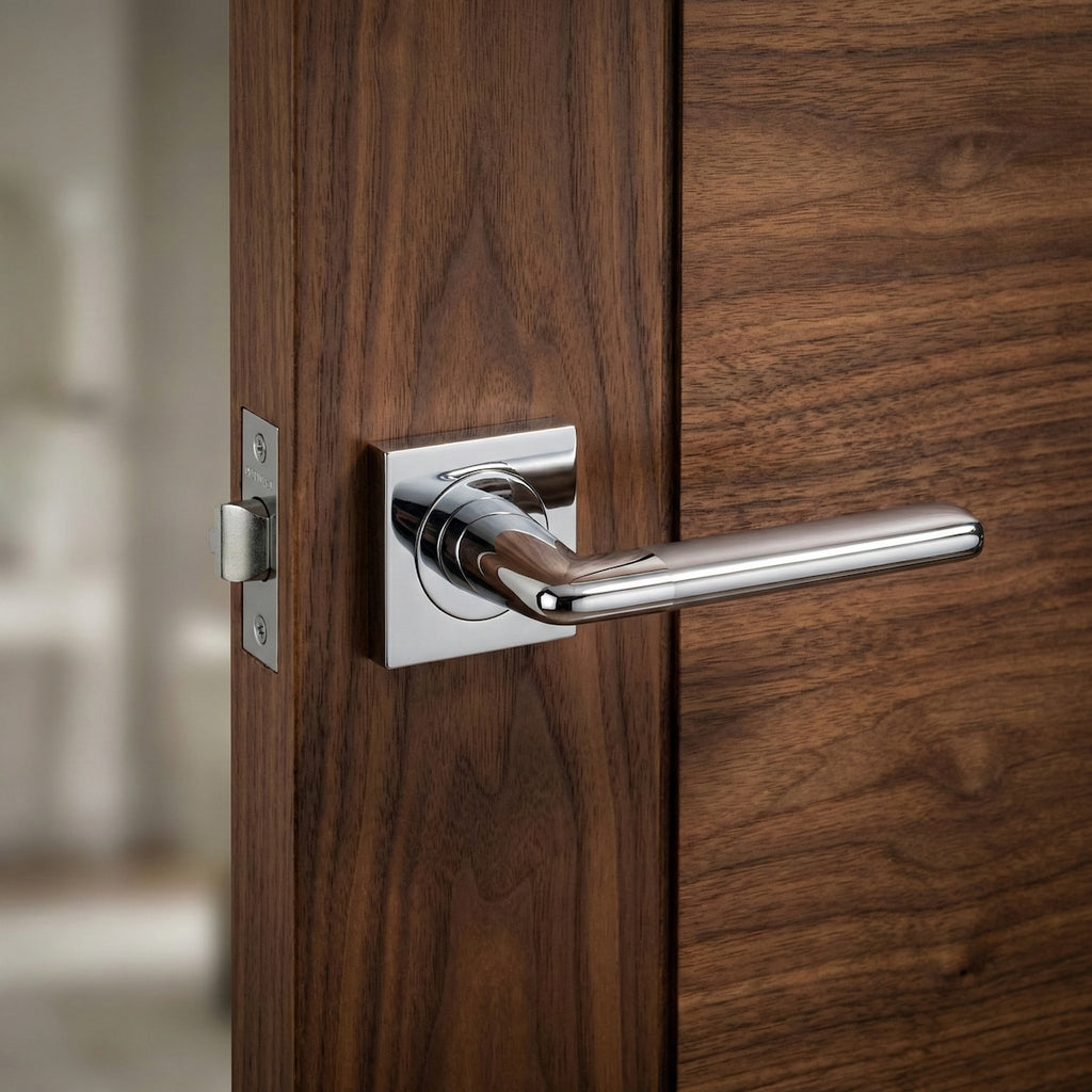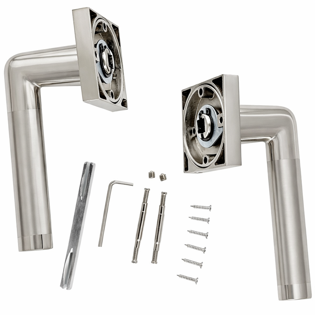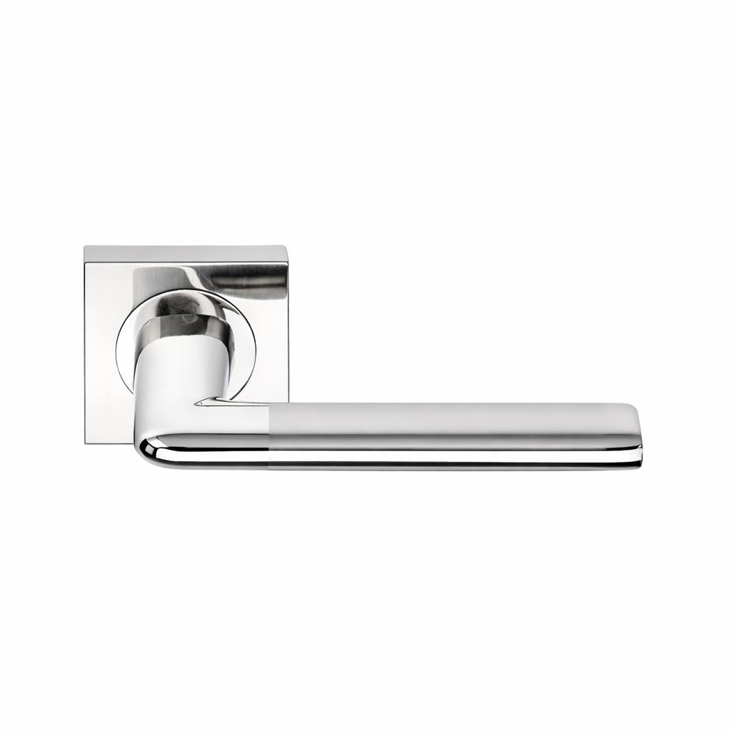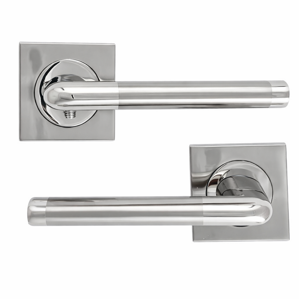 Juego de manillas (2 manillas para una puerta) con roseta cuadrada de aluminio en acabado níquel combinado para puertas de interior y de paso. Esta sencilla manilla acabada en níquel combinado es ideal para vestir las puertas de tu casa. Viene con todos los accesorios de instalación incluidos y su estilo moderno y elegante te aportará luz y novedad a tus puertas ¿A qué esperas para conseguirlo?