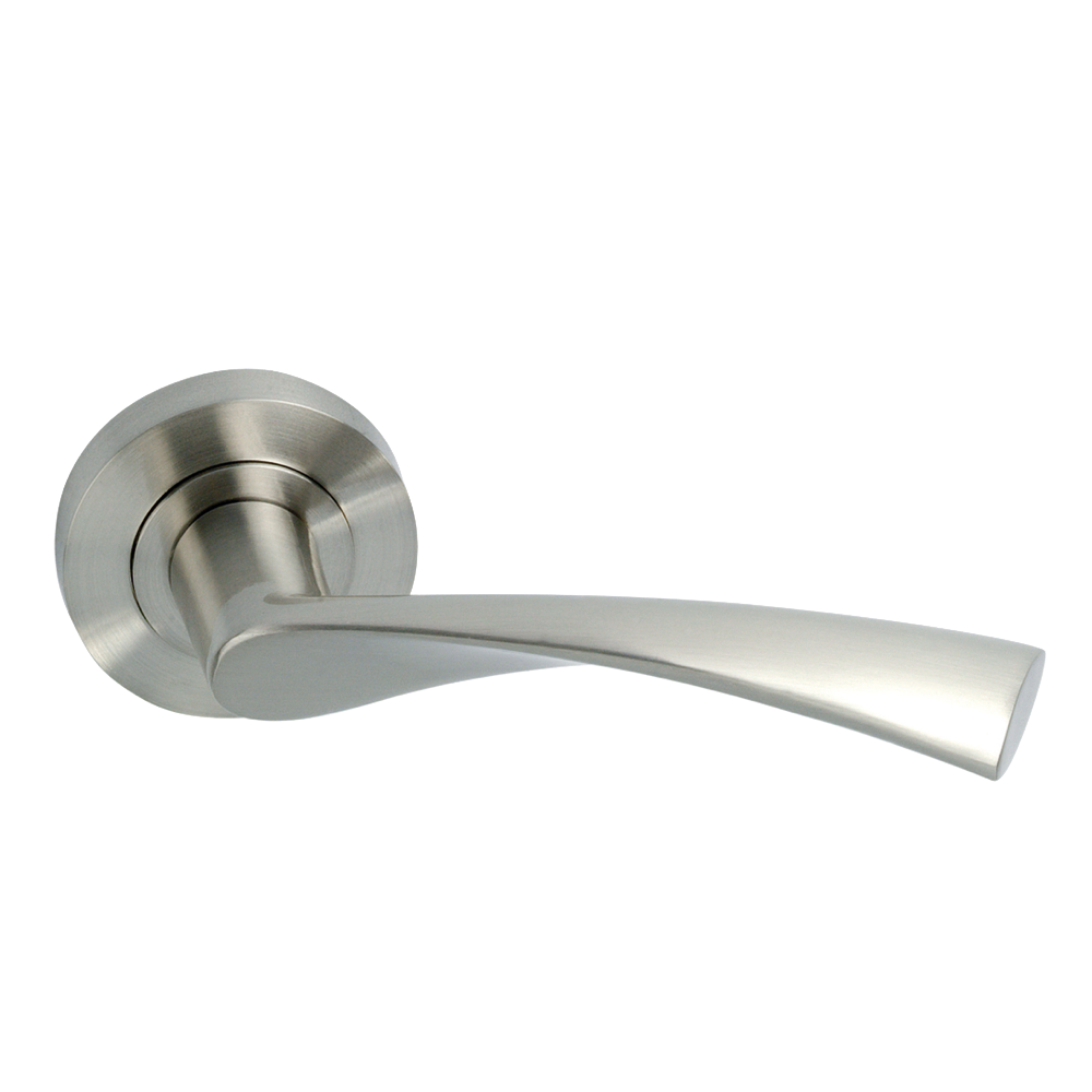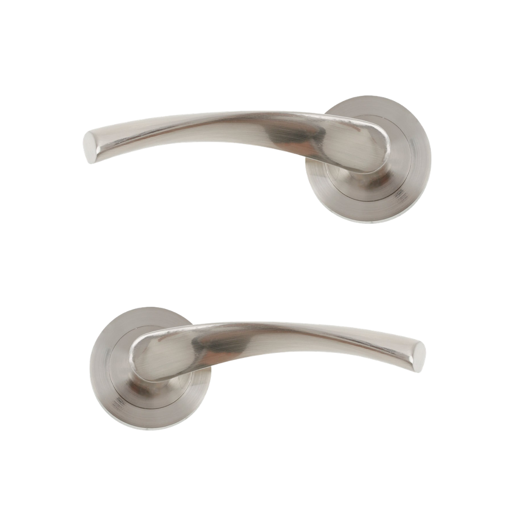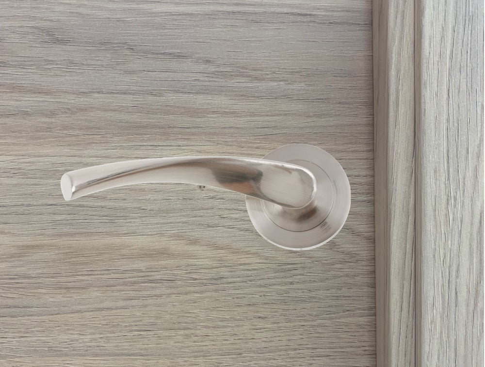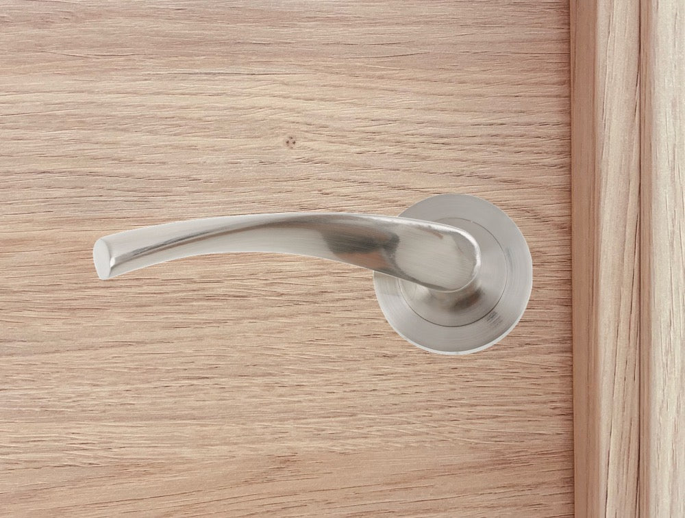 Juego de manillas (2 manillas) para puertas con roseta redonda de aluminio y en acabado níquel satinado, ideal para puertas de paso y puertas de entrada. Esta moderna manilla de linea vanguardista incluye los accesorios necesarios para su instalación. Es el modelo de manilla con roseta más vendido de la historia y verdaderamente tiene un diseño cómodo y práctico para agarrar con la mano. Esta manilla de aluminio conocida como 'La Ola' es ideal para puertas de interior con baja frecuencia de paso.