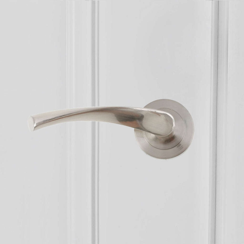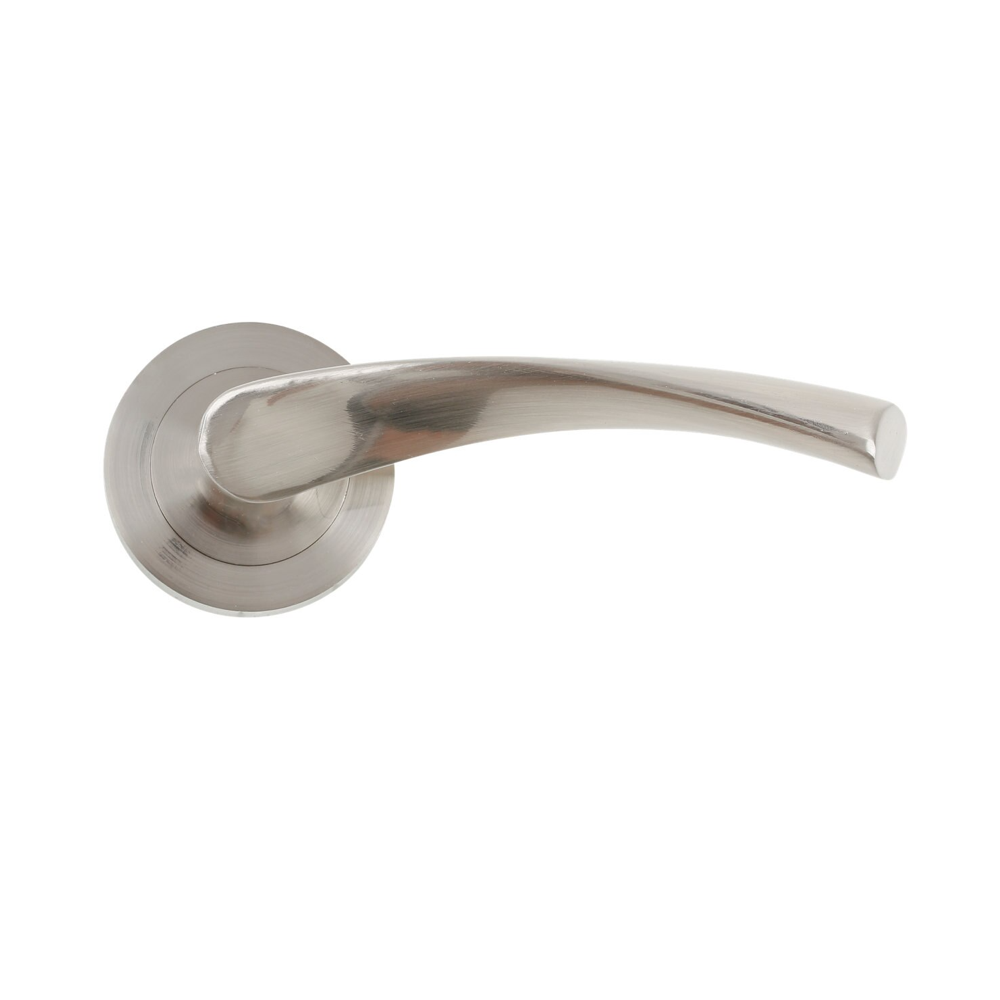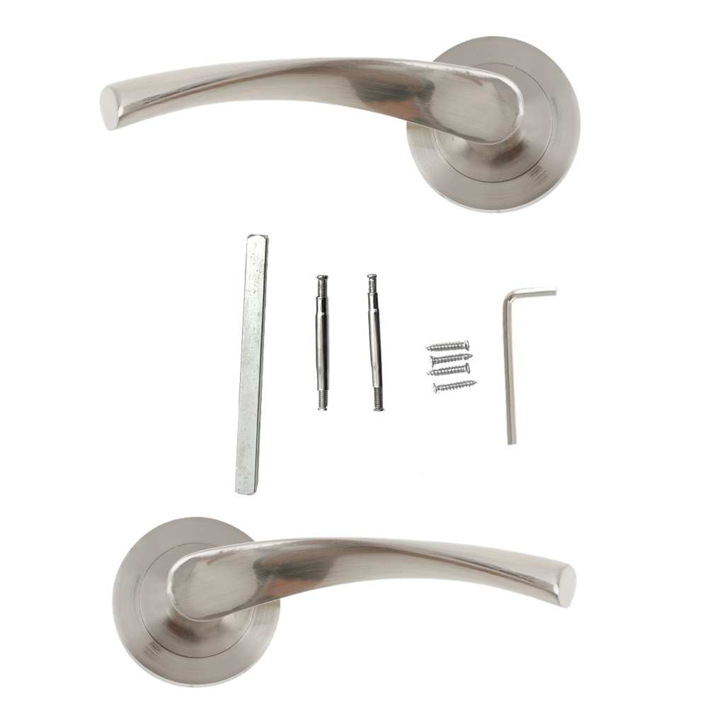 Juego de manillas (2 manillas) para puertas con roseta redonda de aluminio y en acabado níquel satinado, ideal para puertas de paso y puertas de entrada. Esta moderna manilla de linea vanguardista incluye los accesorios necesarios para su instalación. Es el modelo de manilla con roseta más vendido de la historia y verdaderamente tiene un diseño cómodo y práctico para agarrar con la mano. Esta manilla de aluminio conocida como 'La Ola' es ideal para puertas de interior con baja frecuencia de paso.