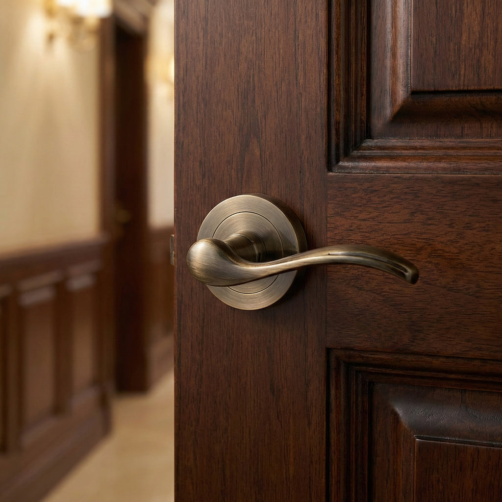 Juego de manillas (2 manillas para una puerta) rústicas onduladas con roseta redonda en acabado cuero para puertas de paso y puertas de interior. Este juego de manillas es de la nueva colección. Unas manillas con roseta redonda en acabado cuero con un toque rústico preparadas para elevar el nivel de tu casa y lucir tus puertas dando una sensación de novedad inigualable. Este juego incluye todos los accesorios de montaje ¿A qué esperas para conseguirlo?