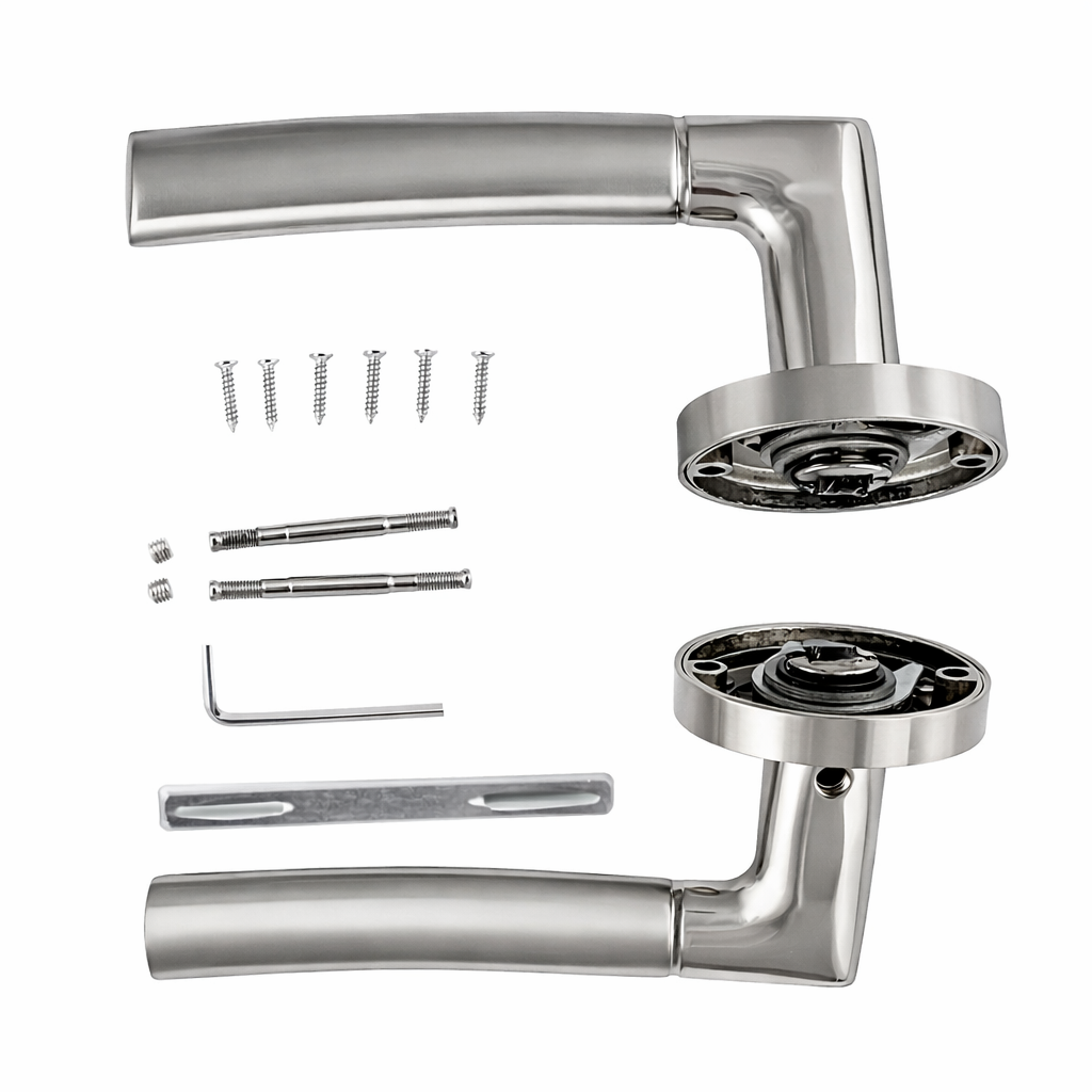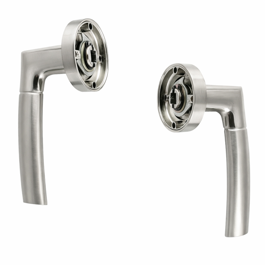 Juego de manillas (2 manillas para una puerta) con roseta redonda de aluminio en acabado níquel combinado para puertas de interior. Esta elegante manilla con roseta es una de nuestras mejores novedades para puertas. Su diseño ergonómico y delicado permite vestir tus puertas logrando una sensación de novedad sobresaliente. Viene con todos los accesorios de instalación incluidos y te la puedes llevar con sus mejores precios. ¿A qué esperas para renovar tus puertas?
