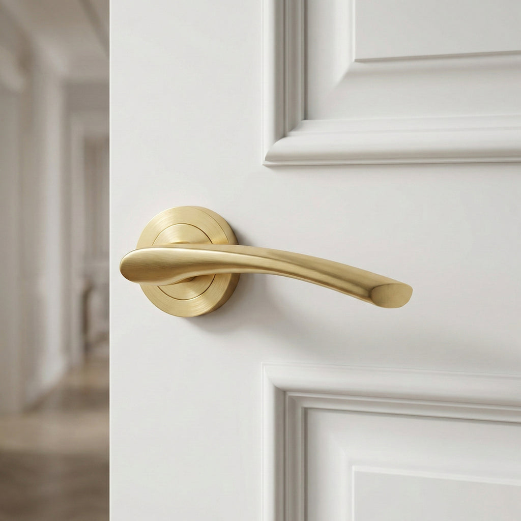 Juego de manillas (2 manillas para una puerta) Anu de aluminio en acabado dorado satinado con roseta redonda para puertas de interior. Este modelo de rosetas en dorado, aportan ese toque vistoso y elegante a tus puertas que transmitirán esa sensación de novedad que estabas buscando. Además, este juego de rosetas dorado viene con todos los accesorios necesarios para hacer la instalación en la puerta y preparada para lucir como nunca antes lo habían hecho tus puertas. ¿A qué esperas para conseguirlo?