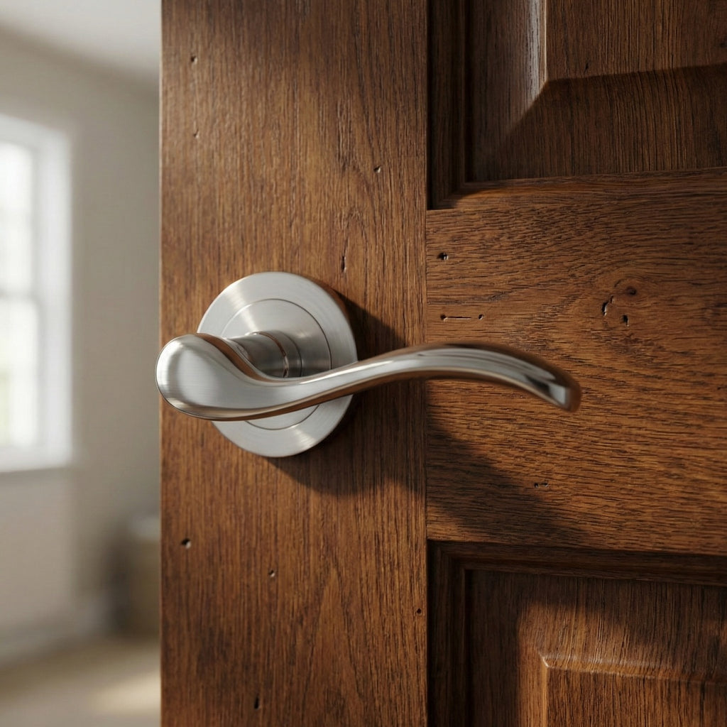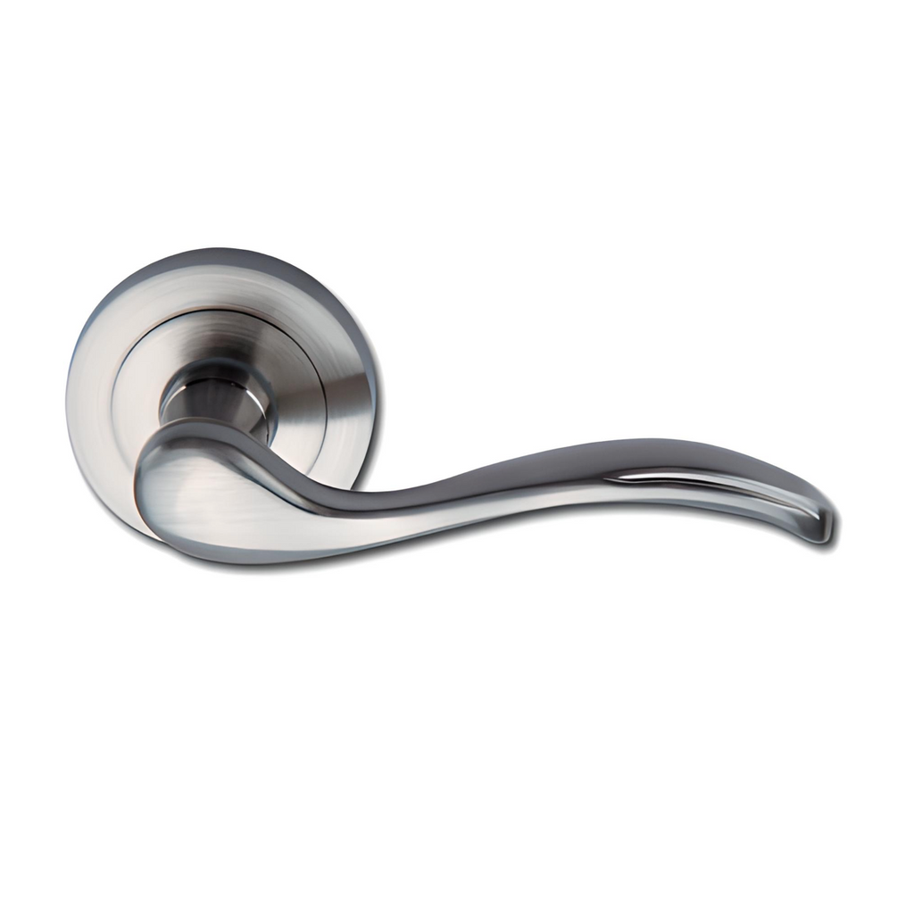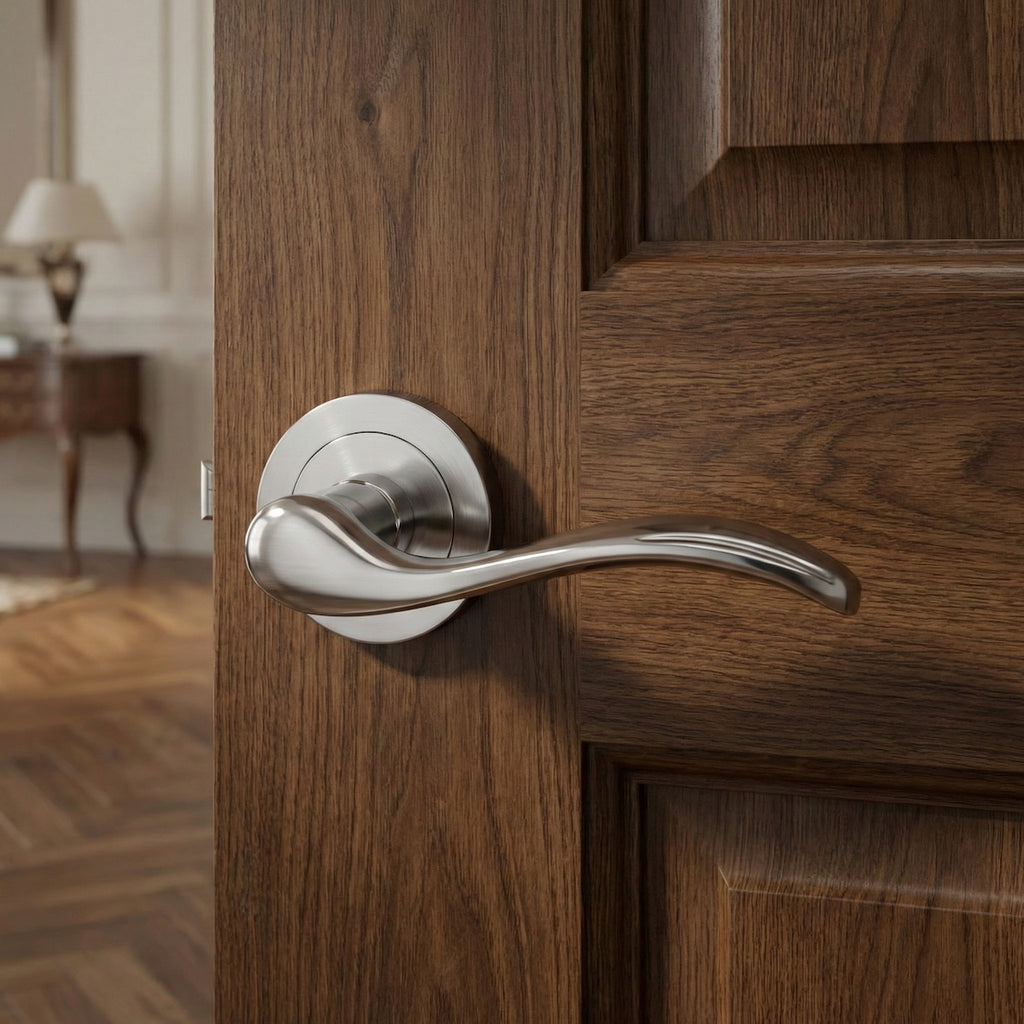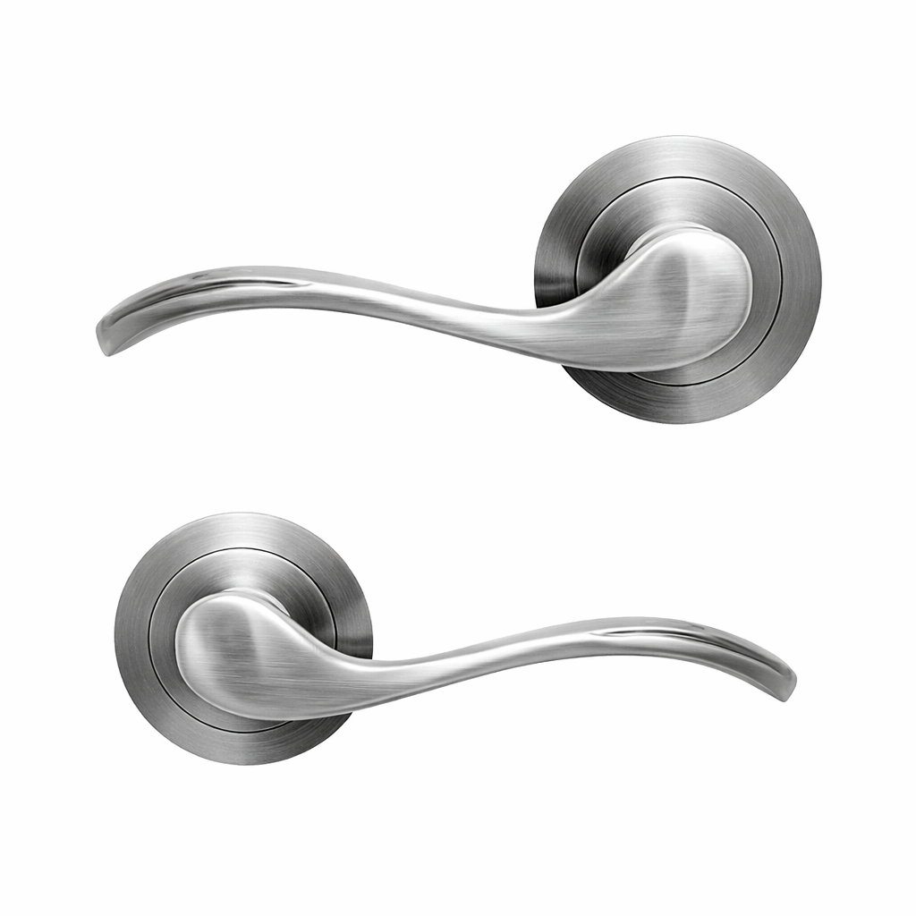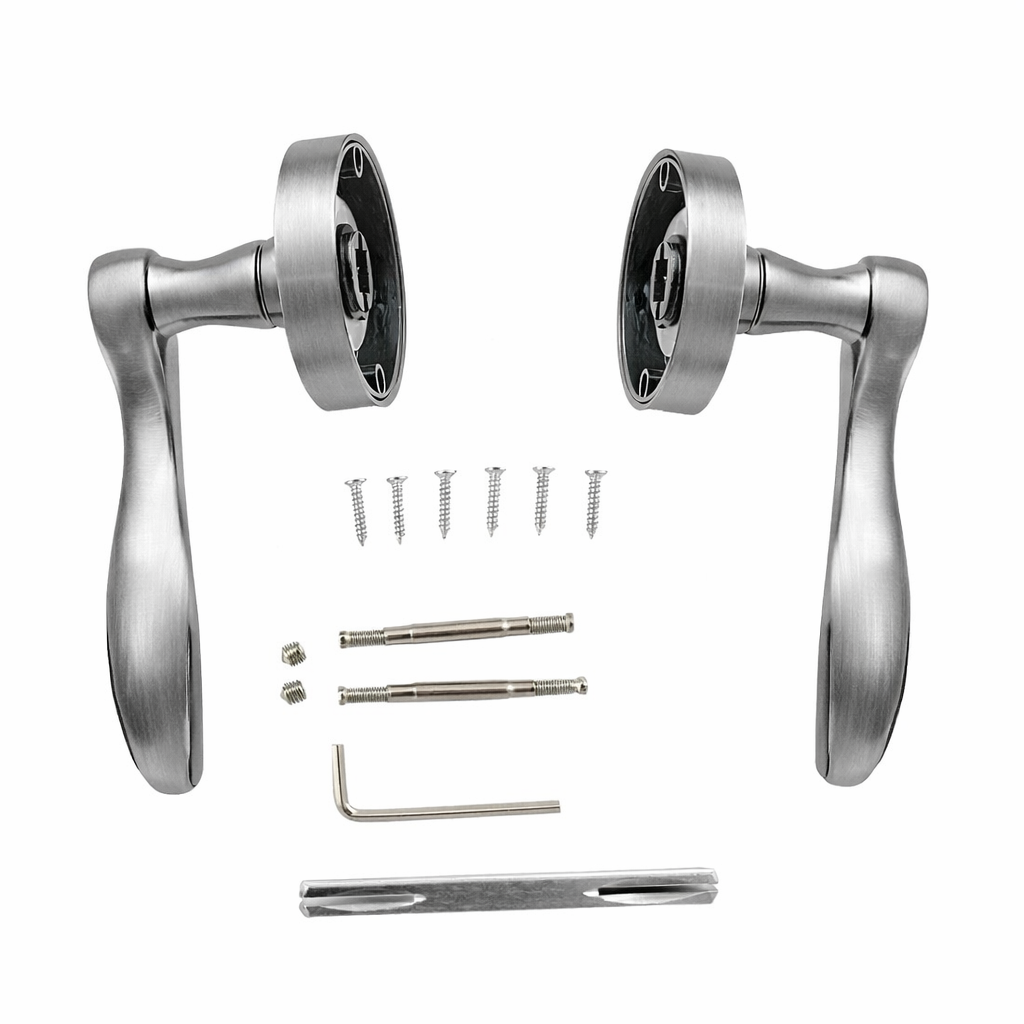Juego de manillas (incluye 2 manillas para una puerta) rústicas con roseta redonda en acabado níquel satinado para puertas de interior. Esta elegante manilla de aluminio con roseta redonda tiene un estilo vanguardista y rústico que le permite combinar con puertas de colores claros y dar un toque renovado a tu hogar. Viene con todos los accesorios de instalación incluidos y preparada para aportar estética a tus puertas.