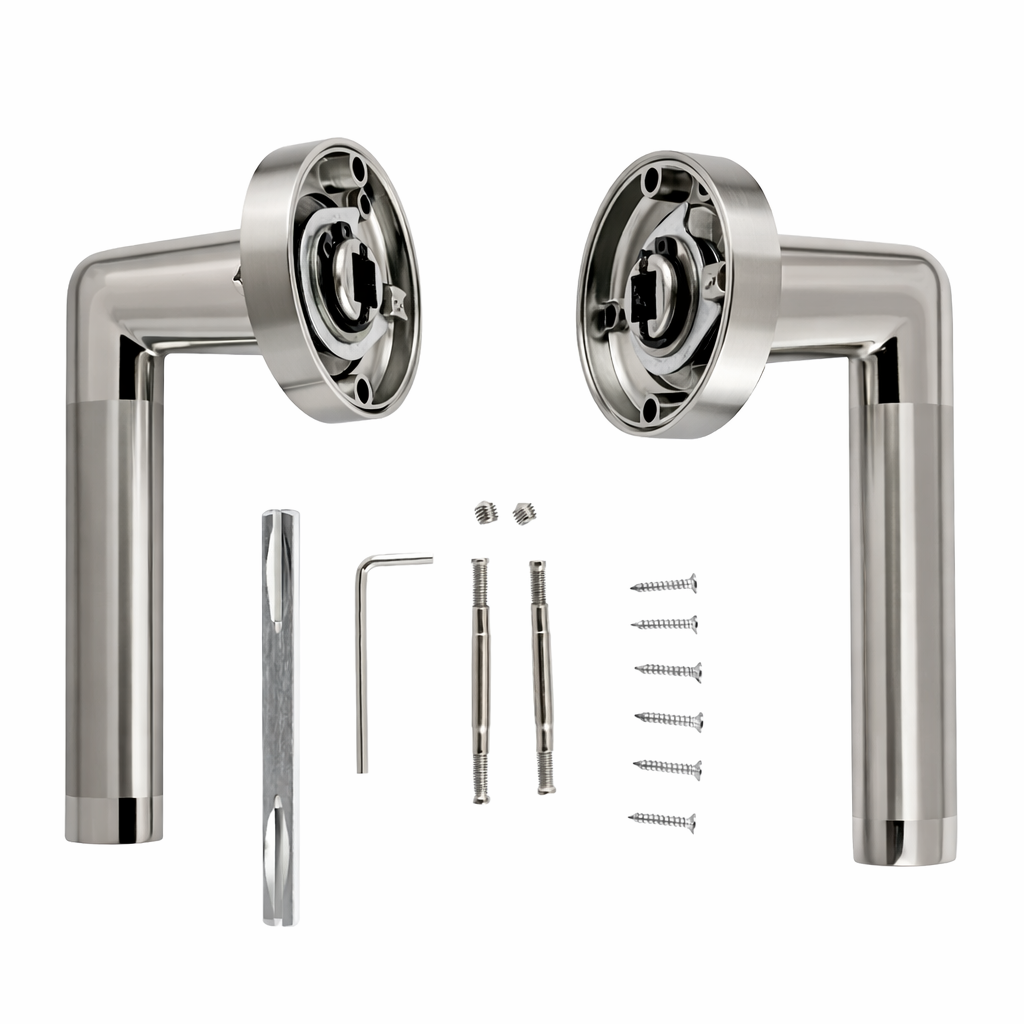 Para su limpieza y cuidado, se recomienda pasar un paño húmedo sobre la manilla. Cuidado no usar productos de limpieza ya que pueden ser corrosivos para la manilla. Para la instalación, introducir el cuadradillo en el picaporte, desenroscar la roseta y atornillar a la madera con los tirafondos o los tornillos pasantes.
