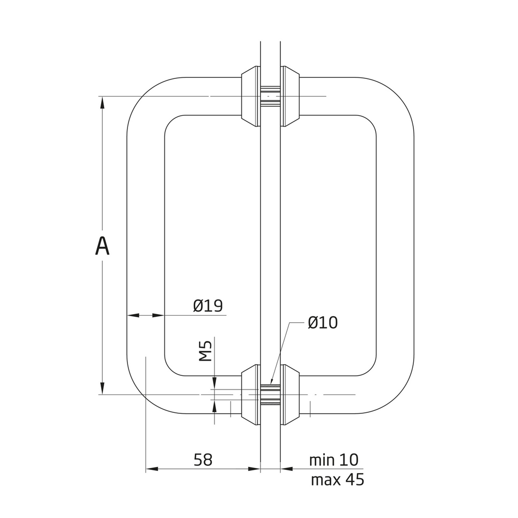 - Juego de manillones roseta de 30mm, de 19mm de diámetro y 600mm entre ejes fabricado en acero inoxidable ideal para puertas de cristal de entre 10 y 45 mm de grosor.