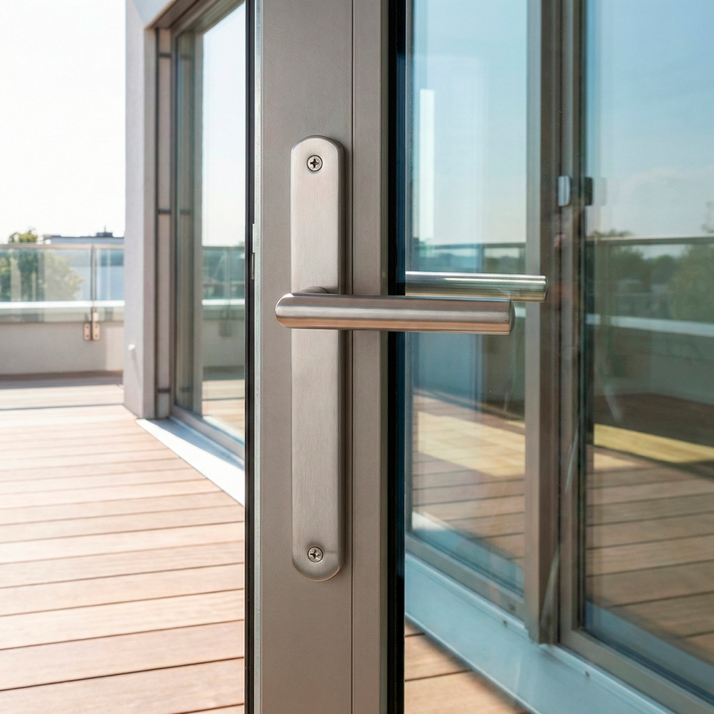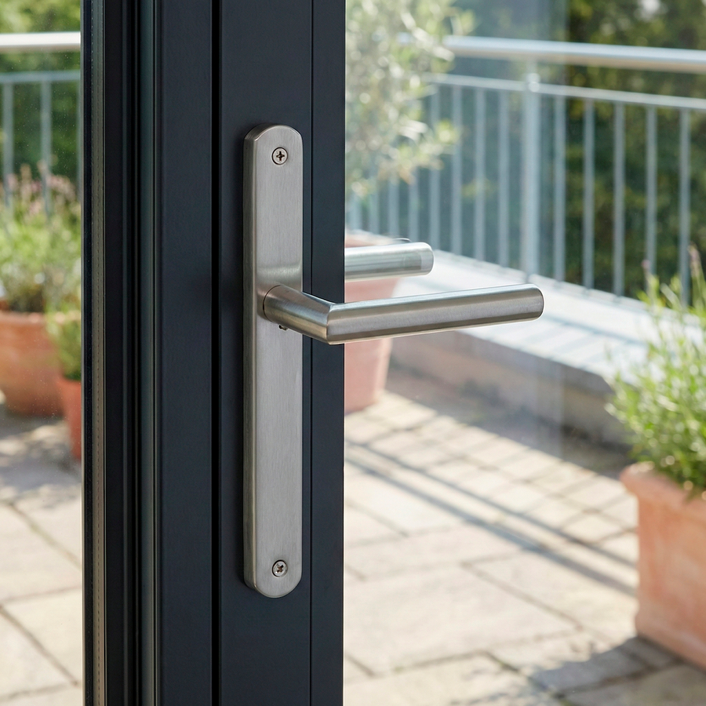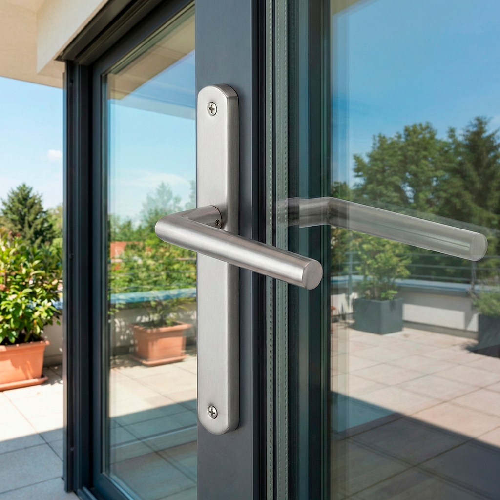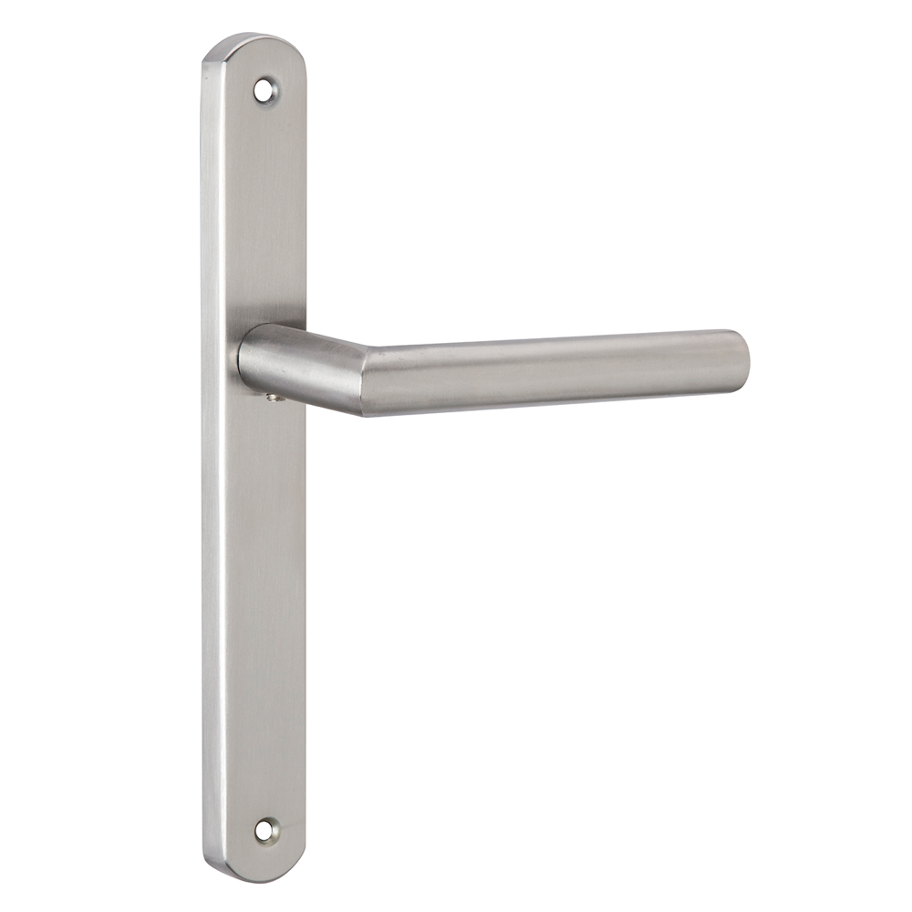 Juego de manillas (1 manilla para cada lado de la puerta) con placa ovalada estrecha de acero inoxidable para puertas modelo 503. Este juego de manillas con placa es ideal para puertas de exterior y de interior. Manilla recomendada para puertas metálicas.