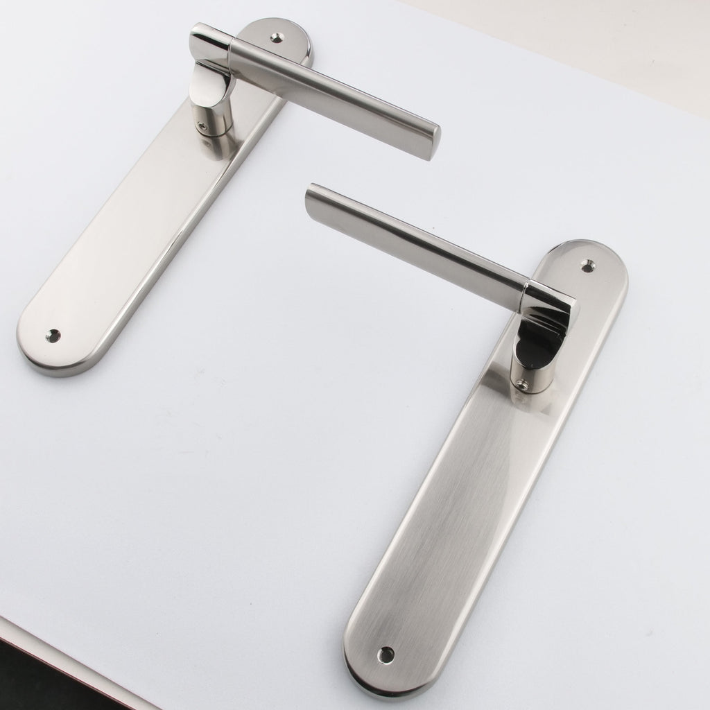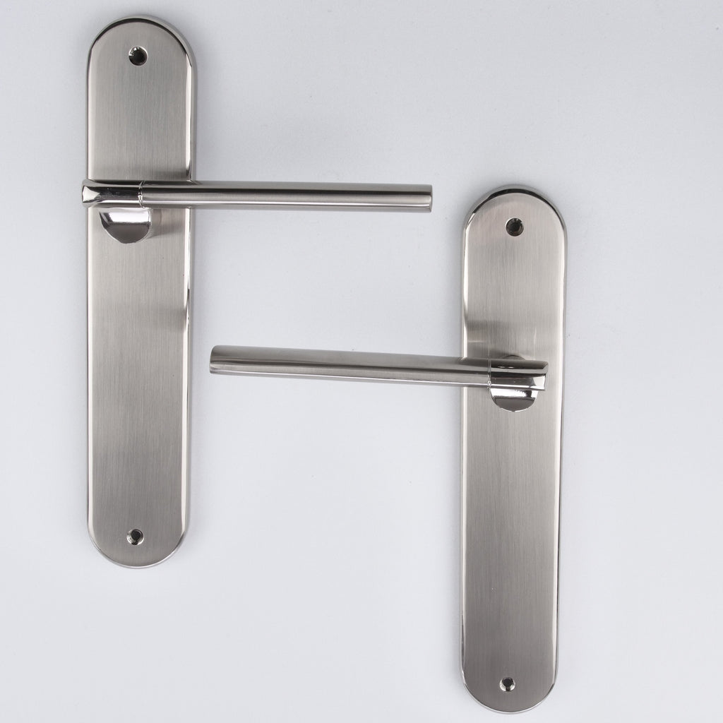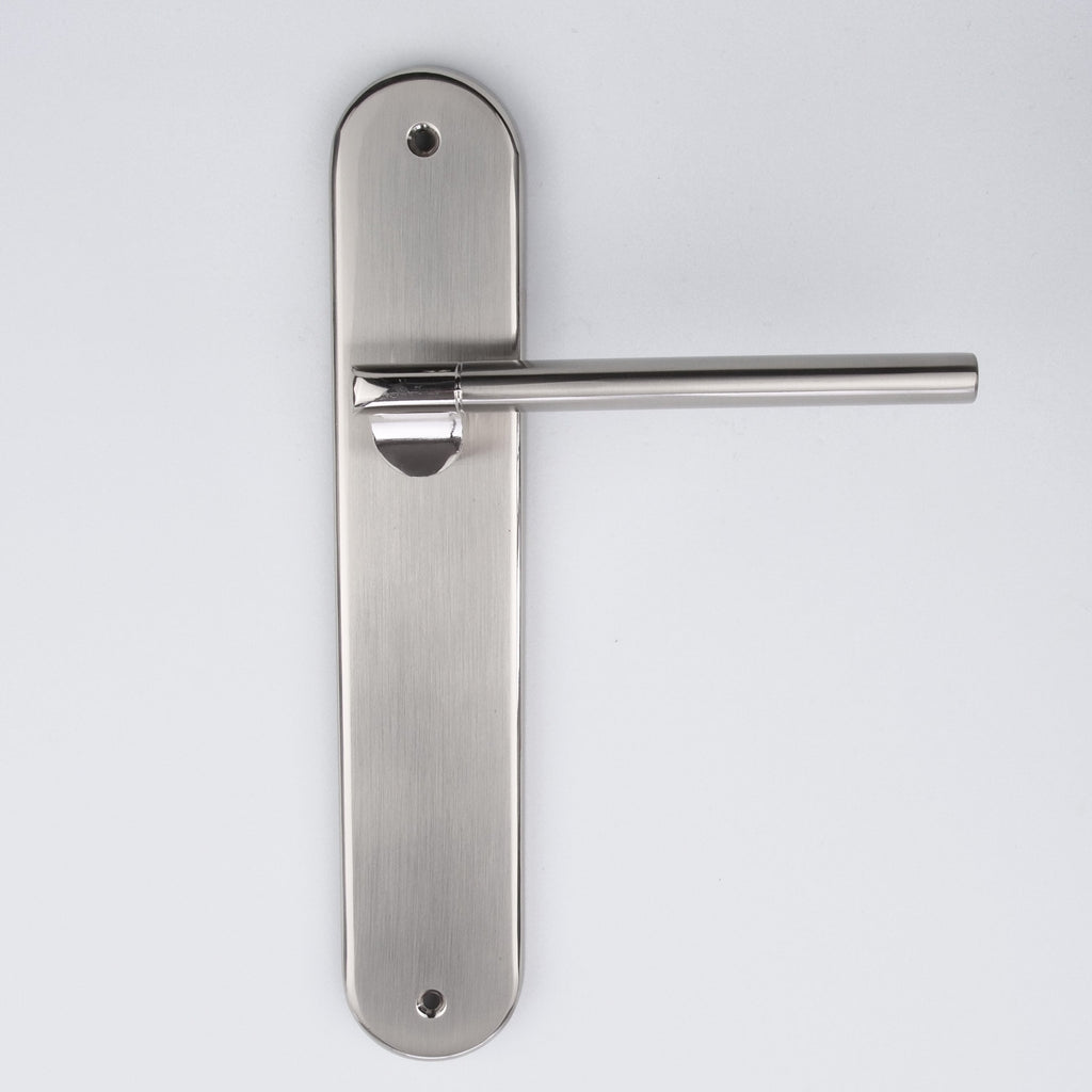 Juego de manillas (2 manillas; 1 manilla para cada lado de la puerta) con placa ovalada de zamak en acabado bicolor para puertas modelo 240. Esta manilla es de gran calidad, capaz de soportar una gran intensidad de uso. Además, viene con todos los accesorios de instalación necesarios.