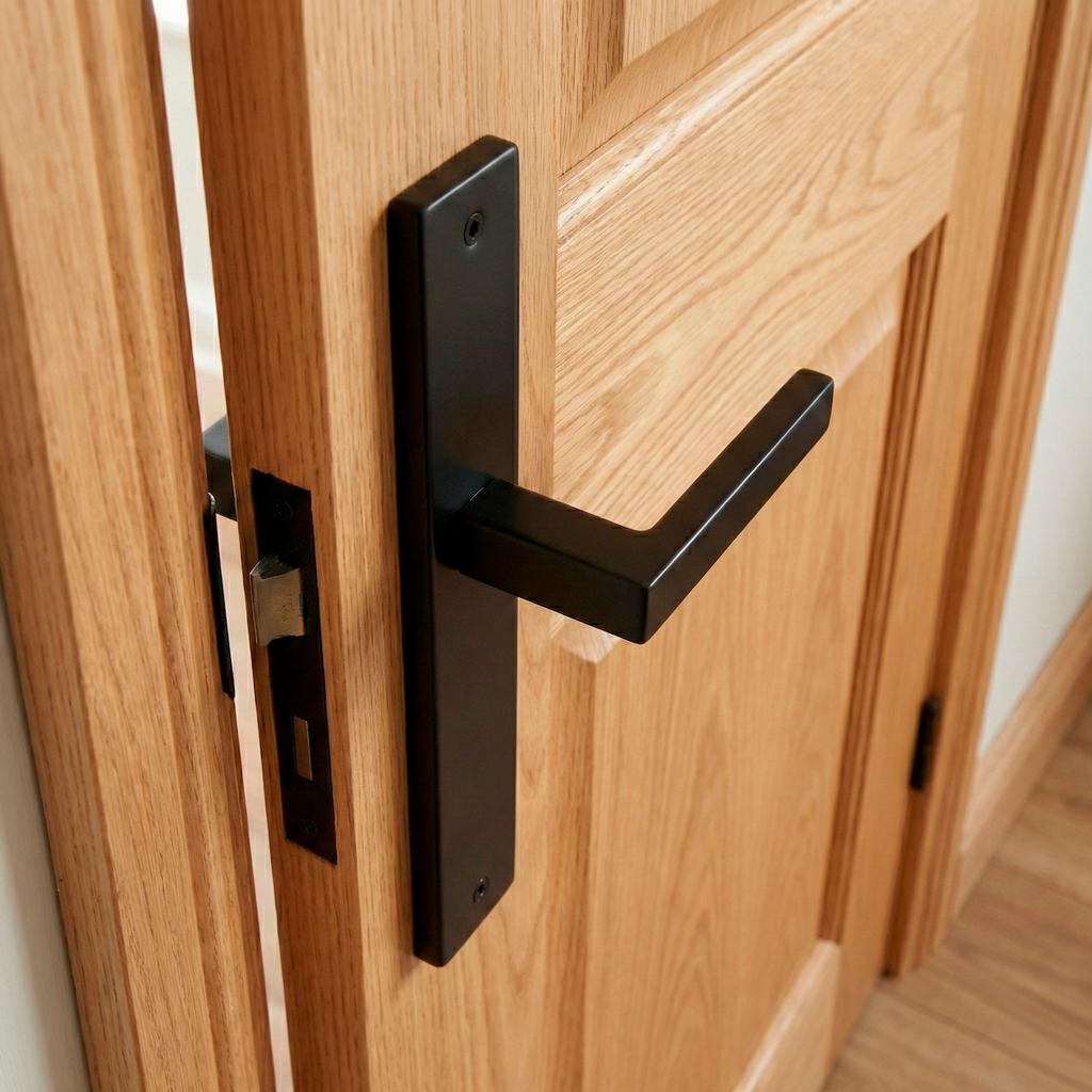 Juego de manillas (2 manillas; 1 manilla para cada lado de la puerta) con placa rectangular de acero inoxidable acabado negro para puertas de interior y de exterior. Esta manilla tiene un diseño vanguardista ideal para conjuntar con tus puertas. Además, viene con todos los accesorios necesarios para su instalación por lo que ¿A qué esperas para renovar tus manillas?