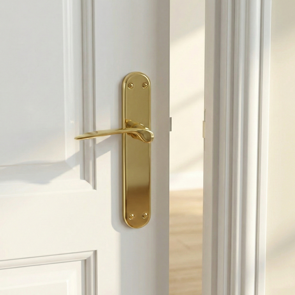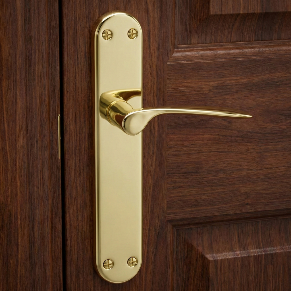 Juego de manillas (2 manillas; 1 para cada lado de la puerta) con placa ovalada de latón en acabado dorado brillo para puertas de interior modelo Pep. Este elegante juego de manillas de la mejor calidad tiene un diseño sencillo y vanguardista preparado para vestir tus puertas. Además, gracias a su material soporta la máxima intensidad de uso por lo que ¿a qué esperas para renovar las manillas de tus puertas?