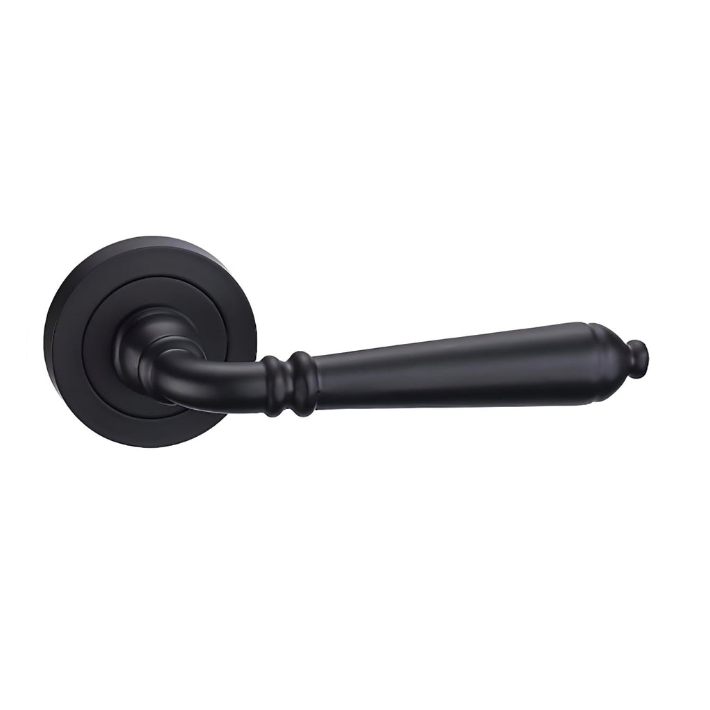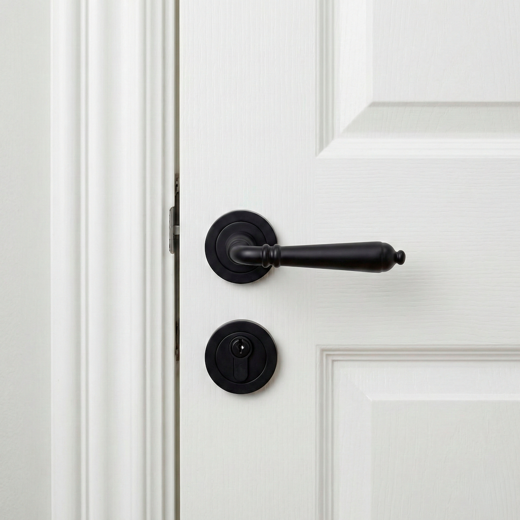 - Juego de manillas modelo Toledo fabricadas en aluminio en acabado negro con la roseta redonda de 52mm ideal para las puertas de tu hogar.