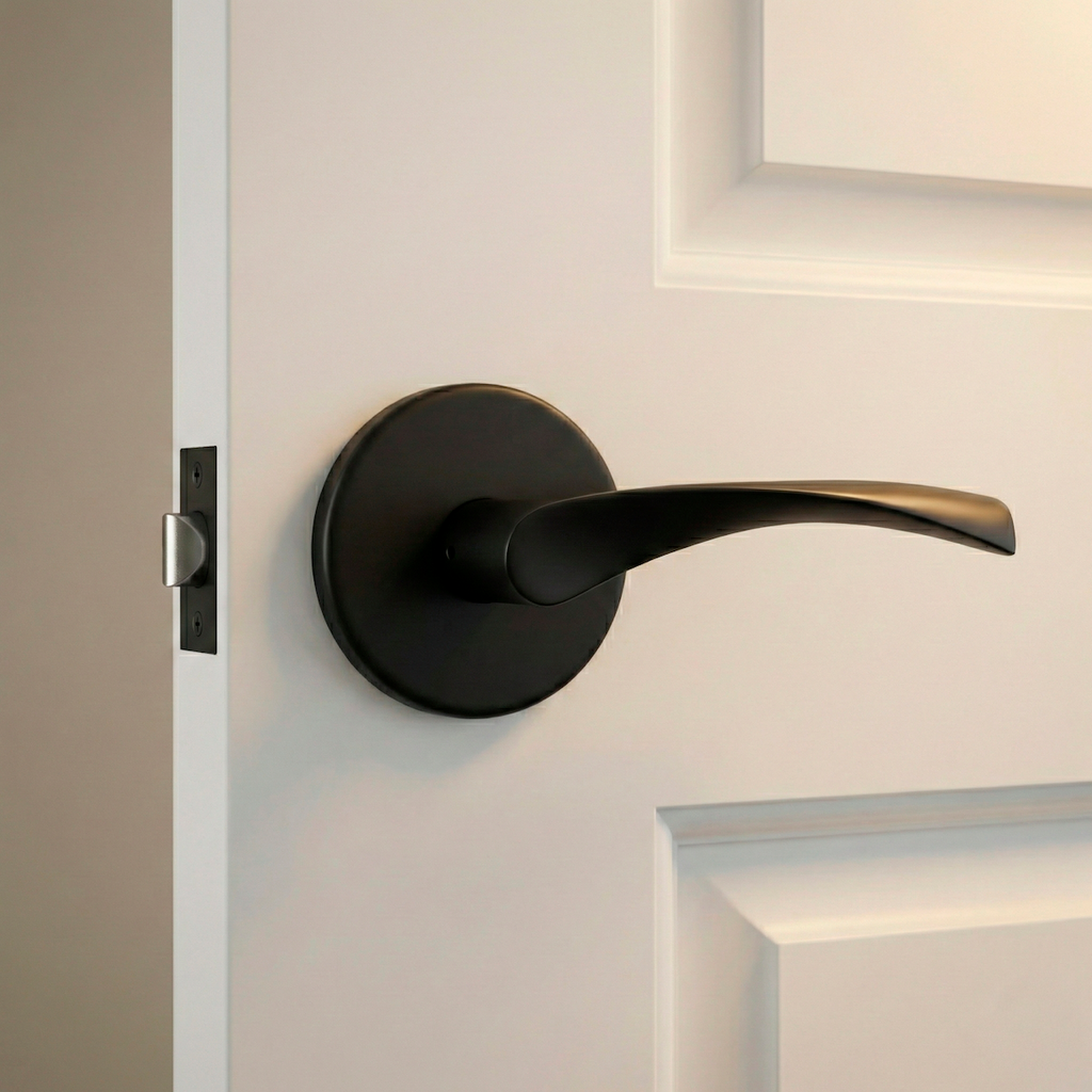 Juego de manillas tapa-pomos para puertas con roseta redonda de aluminio y en acabado negro, ideal para puertas de paso. Esta manilla es una solución práctica y económica para tapar los agujeros de los tira fondos de las rosetas instaladas anteriormente y para evitar cambiar tus puertas. Gracias a la ARI130, y al diámetro de su roseta (65mm) podrás tapar los agujeros de los pomos.