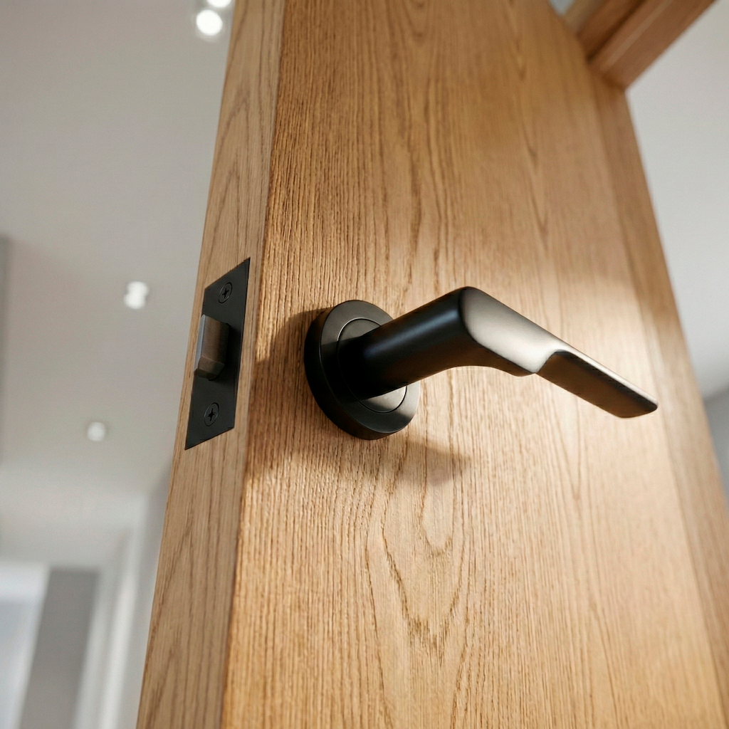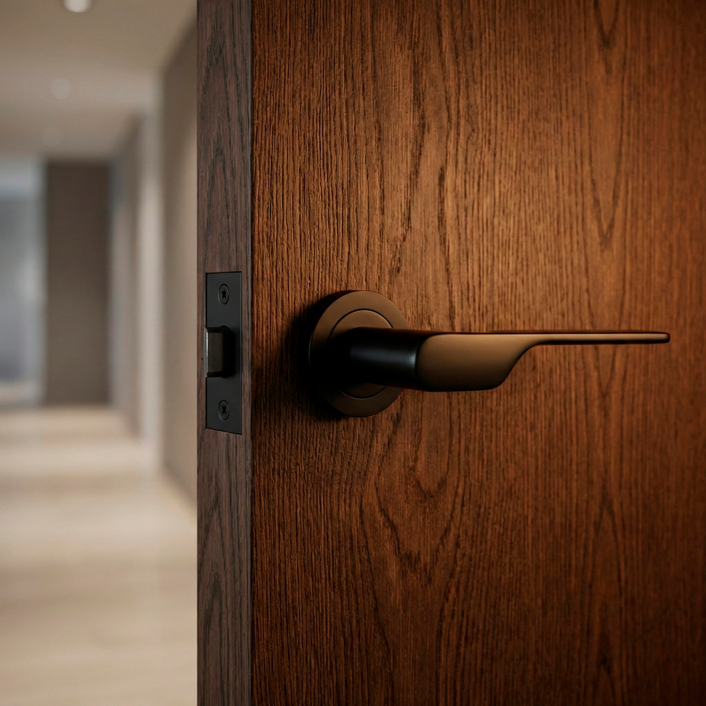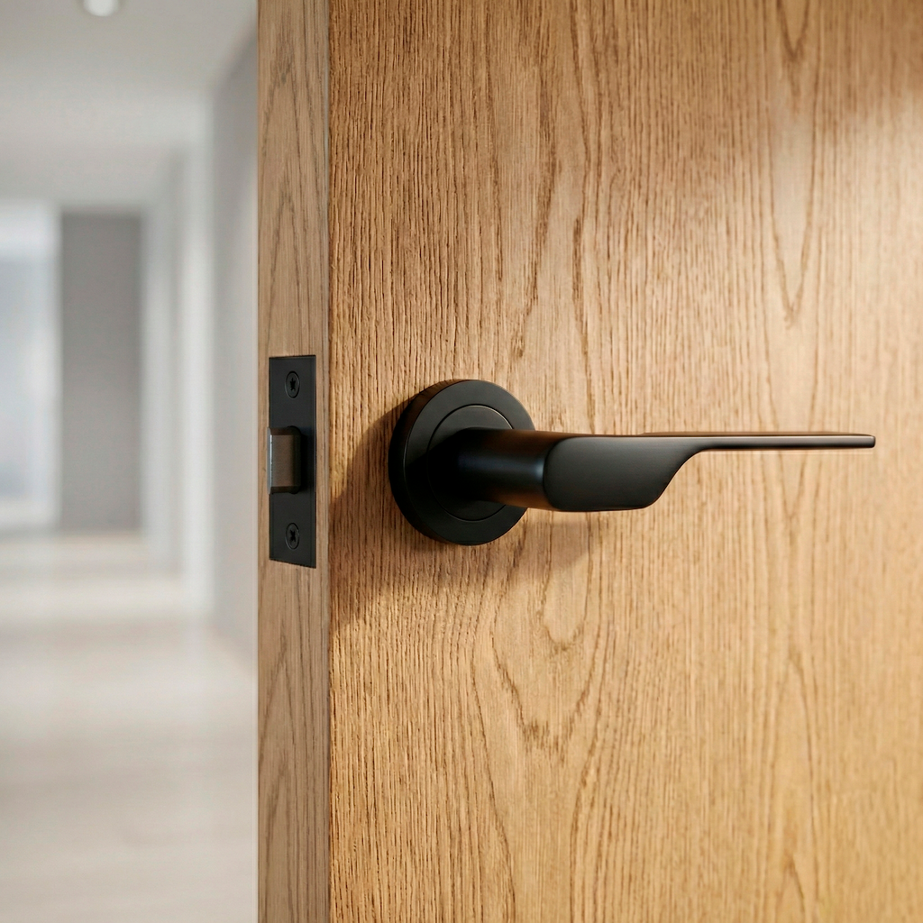 Juego de manillas (incluye 2 manillas para una puerta) modelo 640 de zamak con roseta redonda en acabado negro ideal para puertas de interior y de paso. Esta manilla es una de nuestras novedades 2022. Tiene un diseño vanguardista, una forma de instalación de roseta novedoso y una resistencia a mucha intensidad de uso. Además, viene con todos los accesorios necesarios para su instalación.