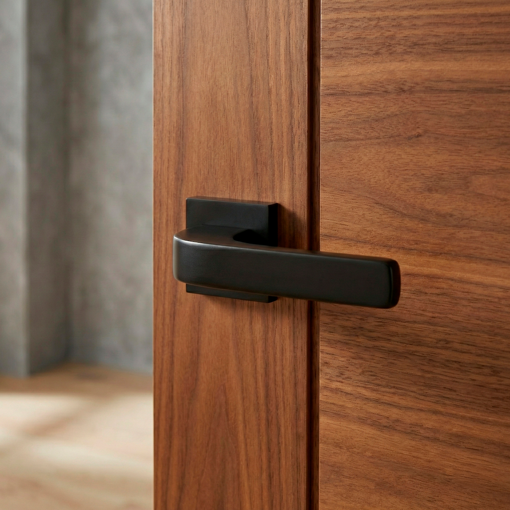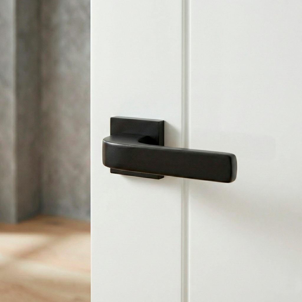 Juego de manillas (incluye 2 manillas para una puerta) modelo 710 de zamak con roseta cuadrada en acabado negro ideal para puertas de interior y de paso. Esta manilla es una de nuestras novedades 2022. Tiene un diseño vanguardista, una forma de instalación de roseta novedoso y una resistencia a mucha intensidad de uso. Además, viene con todos los accesorios necesarios para su instalación.