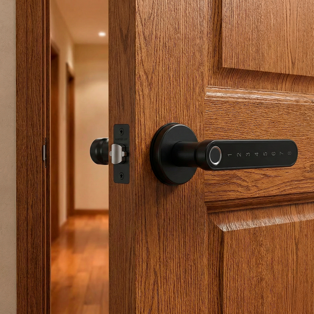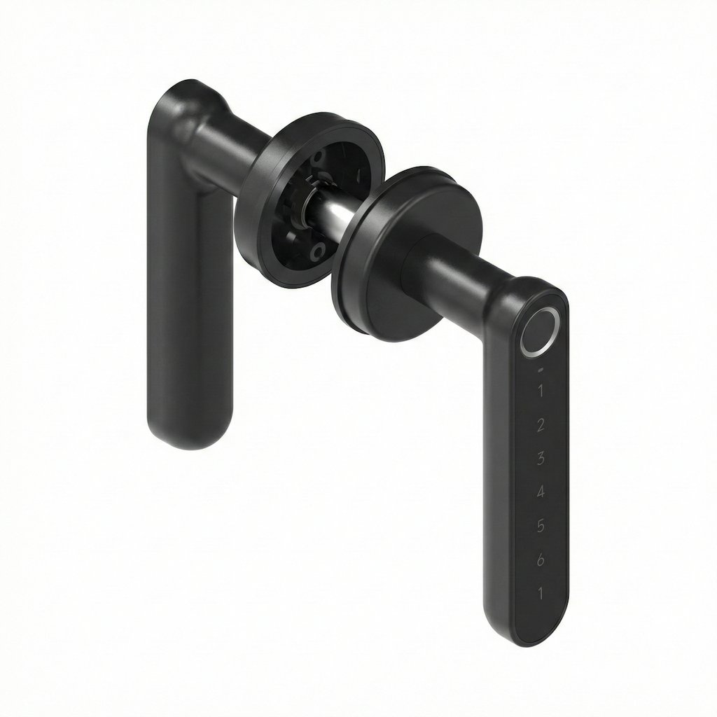 - Por el interior es una manilla con roseta normal y por el exterior es una manilla de apertura de seguridad con panel táctil, huella y tecnología bluetooth.