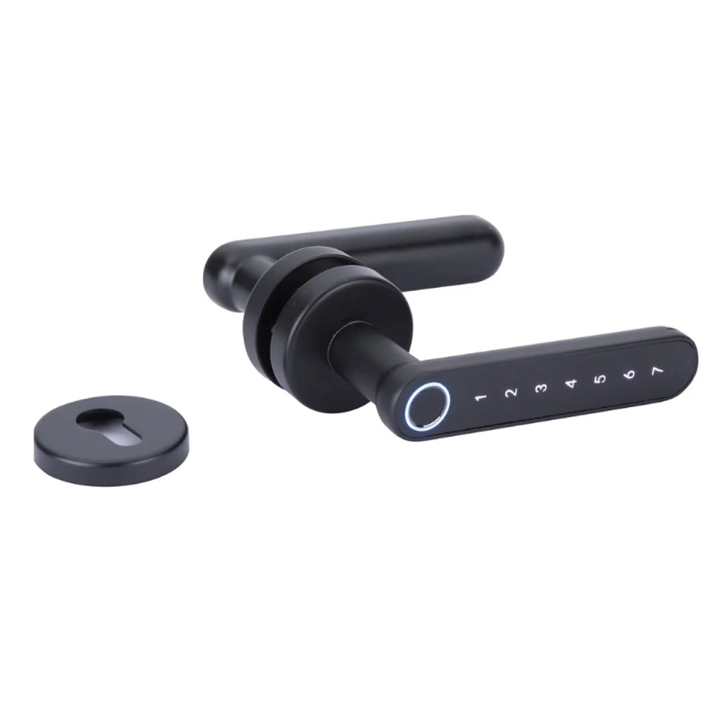 - Manilla electrónica con roseta redonda en negro de apertura mediante pin, huella y aplicación móvil ideal para alquiler vacacional.