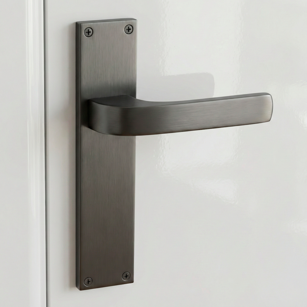 Juego de manillas (2 manillas; 1 manilla para cada lado de la puerta) con placa rectangular de zamak en acabado grafito para puertas de interior. Esta manilla es una de nuestras mejores novedades. Su diseño elegante y cargado de detalles aporta a tus puertas un toque vanguardista y moderno. Además, es una manilla de alto standing capaz de soportar mucha intensidad de uso por lo que ¿A qué esperas para renovar las manillas de tus puertas?