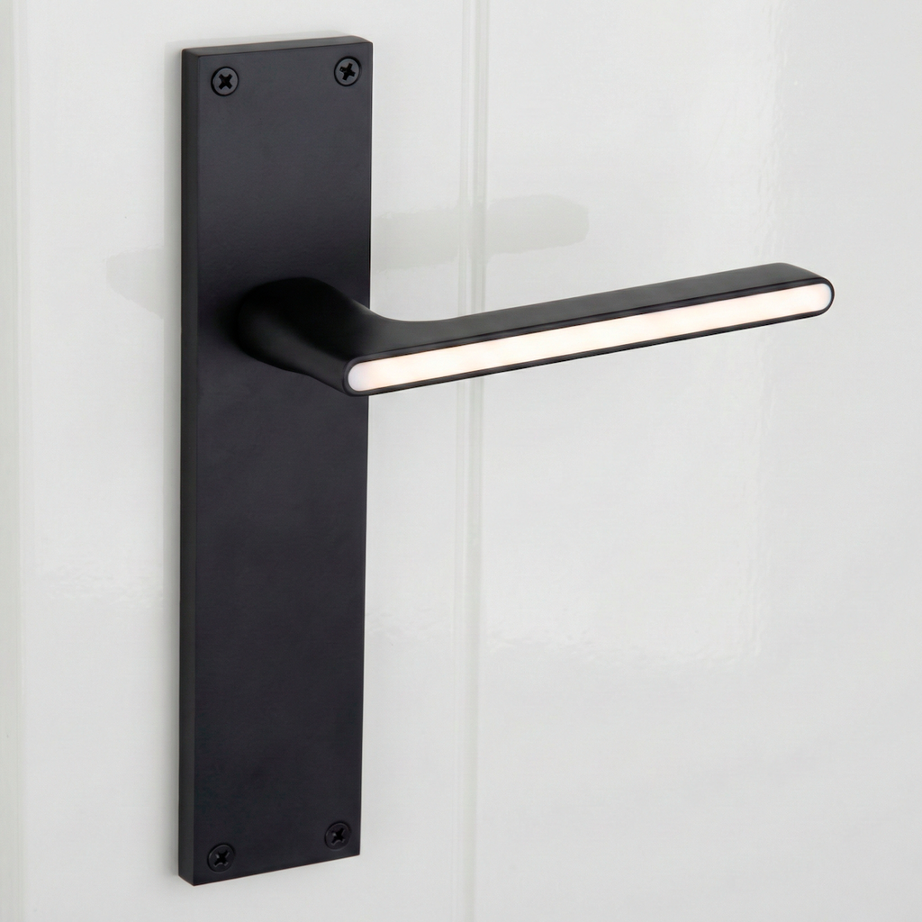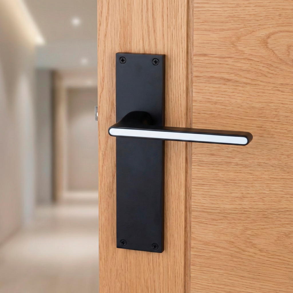 Juego de manillas (2 manillas; 1 manilla para cada lado de la puerta) con placa rectangular de zamak en acabado negro con linea blanca para puertas de interior. Esta manilla es una de nuestras mejores novedades. Su diseño elegante y cargado de detalles aporta a tus puertas un toque vanguardista y moderno. Además, es una manilla de alto standing capaz de soportar mucha intensidad de uso por lo que ¿A qué esperas para renovar las manillas de tus puertas?