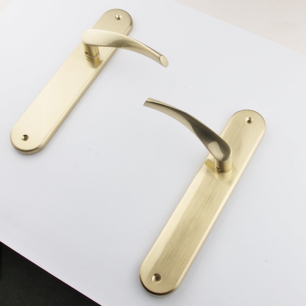 Juego de manillas (2 manillas; 1 para cada lado de la puerta) con placa ovalada modelo 130 de zamak en acabado dorado satinado para puertas de interior. Este juego de manillas con placa tiene un diseño vanguardista ideal para conjuntar con tus puertas. El dorado es un acabado que conjunta bien con la mayoría de tonalidades y el aluminio un material preparado para soportar cierta intensidad de uso. Si no te lo crees, pruébalo. Además, incluye todos los accesorios necesarios para su instalación.
