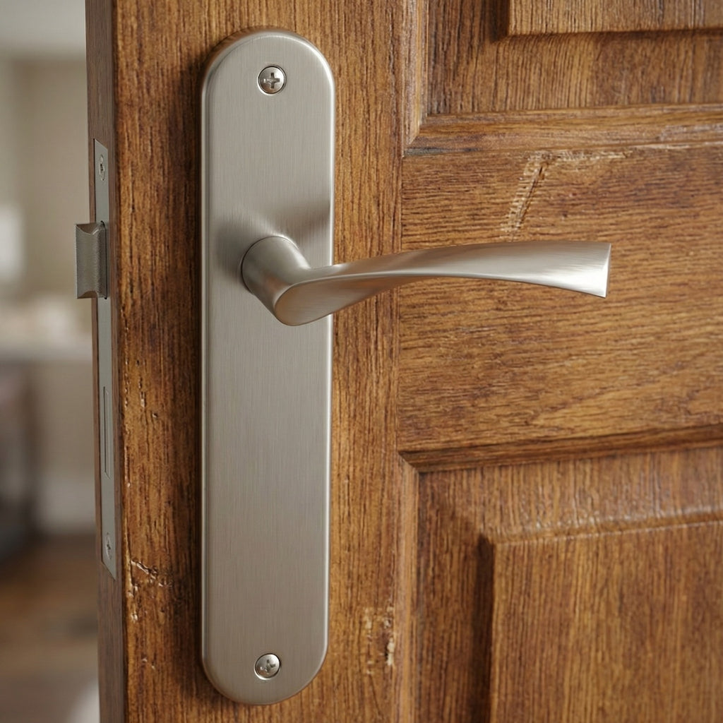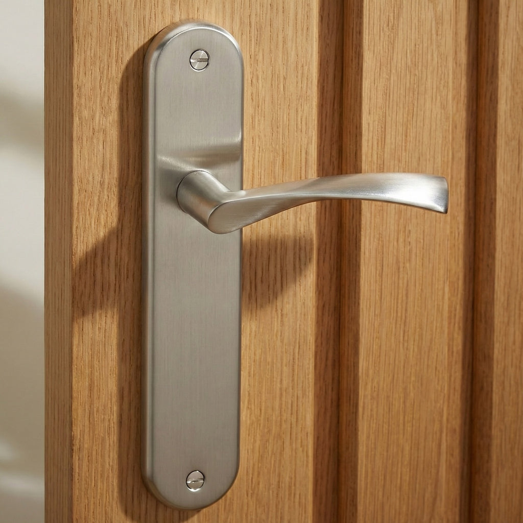 Juego de manillas (1 manilla para cada lado de la puerta) ola con placa ovalada para puertas modelo 130 en acabado níquel satinado. Esta clásica manilla de dos tornillos, uno en la parte superior y otro en la inferior) sigue una linea elegante y discreta para instalar en las puertas de tu hogar. Renueva las manillas de tus puertas al mejor precio. Además, incluye todos los accesorios necesarios para su instalación.