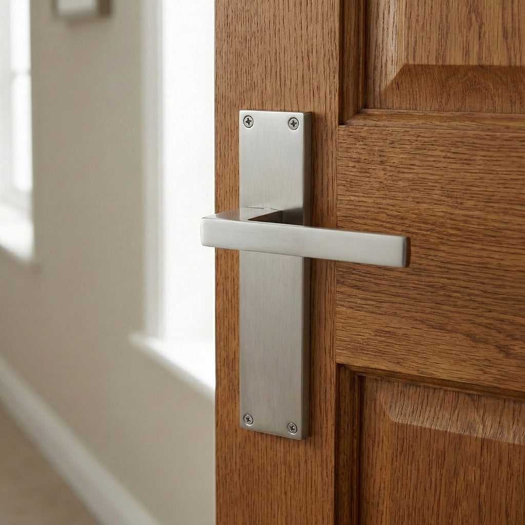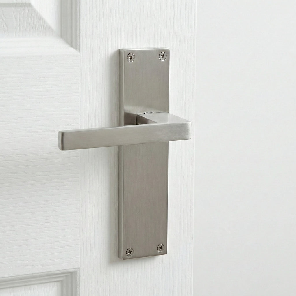 Juego de manillas (2 manillas; 1 manilla para cada lado de la puerta) con placa rectangular de zamak en acabado níquel satinado para puertas de interior modelo 220. Esta manilla con placa de diseño vanguardista, es ideal para las puertas de tu hogar. Su acabado y su estilo moderno permite aportar luz y decorar hasta los pequeños detalles de tu hogar. Además, viene con los accesorios de instalación incluidos por lo que ¿A qué esperas para renovar las manillas de tus puertas?