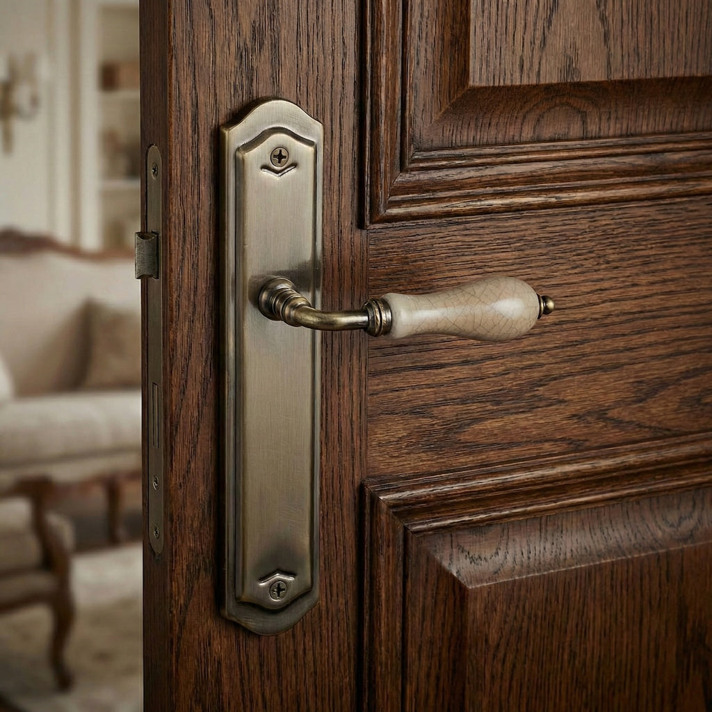 Juego de manillas (2 manillas; 1 manilla para cada lado de la puerta) con placa ovalada curva de zamak acabado cuero y porcelana para puertas modelo 4008. Esta rústica manilla con placa tiene un diseño original ideal para las puertas de tu hogar. Gracias a su diseño aporta luz y elegancia a tu hogar. Además, viene con todos los accesorios necesarios para su instalación por lo que ¿A que esperas para cambiar las manillas de tus puertas?