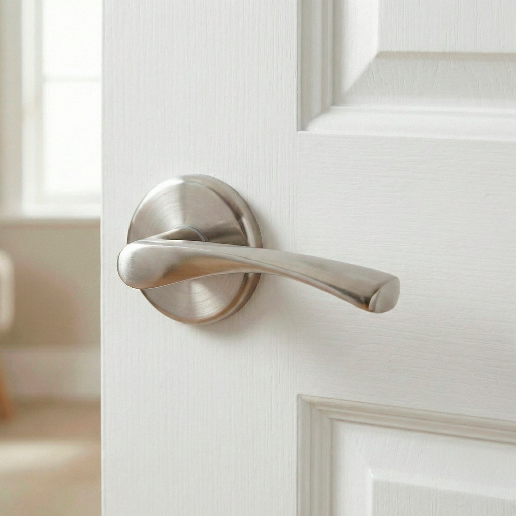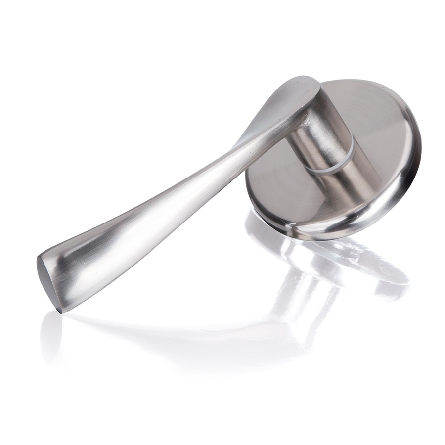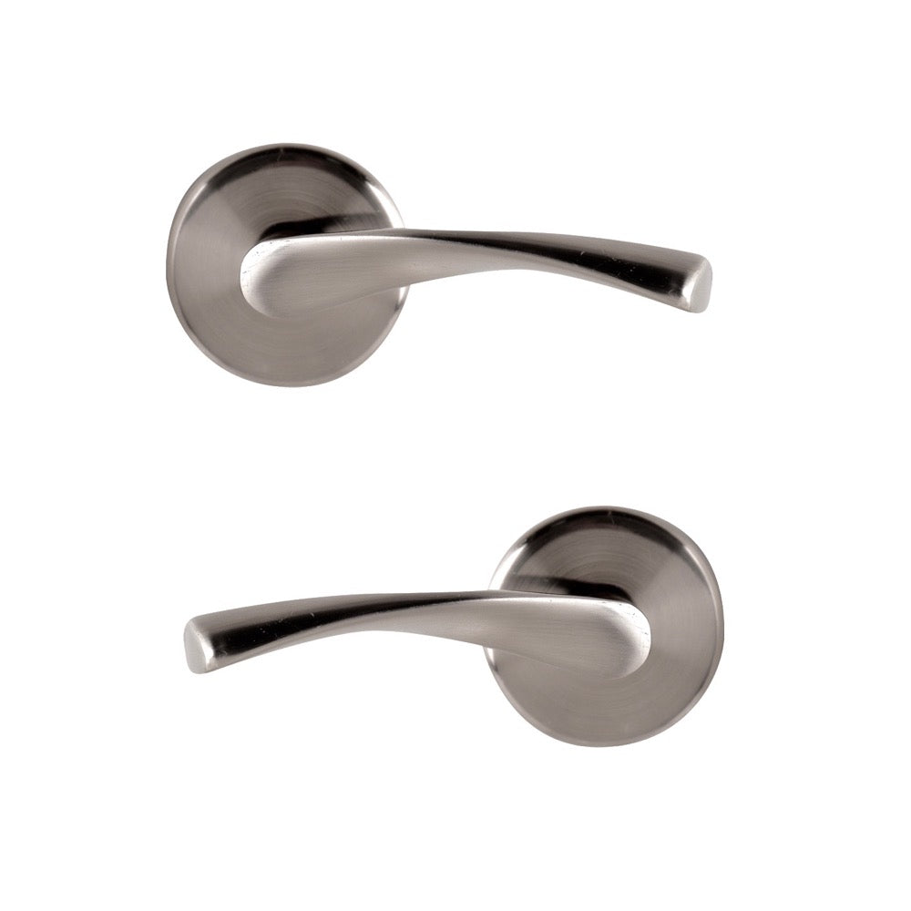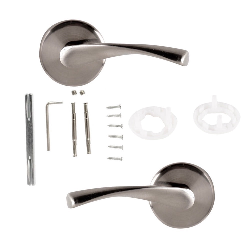 Juego de manillas (2 manillas) tapa-pomos para puertas con roseta redonda de aluminio y en acabado níquel satinado, ideal para puertas de paso. Esta manilla es una solución práctica y económica para tapar los agujeros de los tira fondos de las rosetas instaladas anteriormente y para evitar cambiar tus puertas. Gracias a la ARI130, y al diámetro de su roseta (65mm) podrás tapar los agujeros de los pomos.