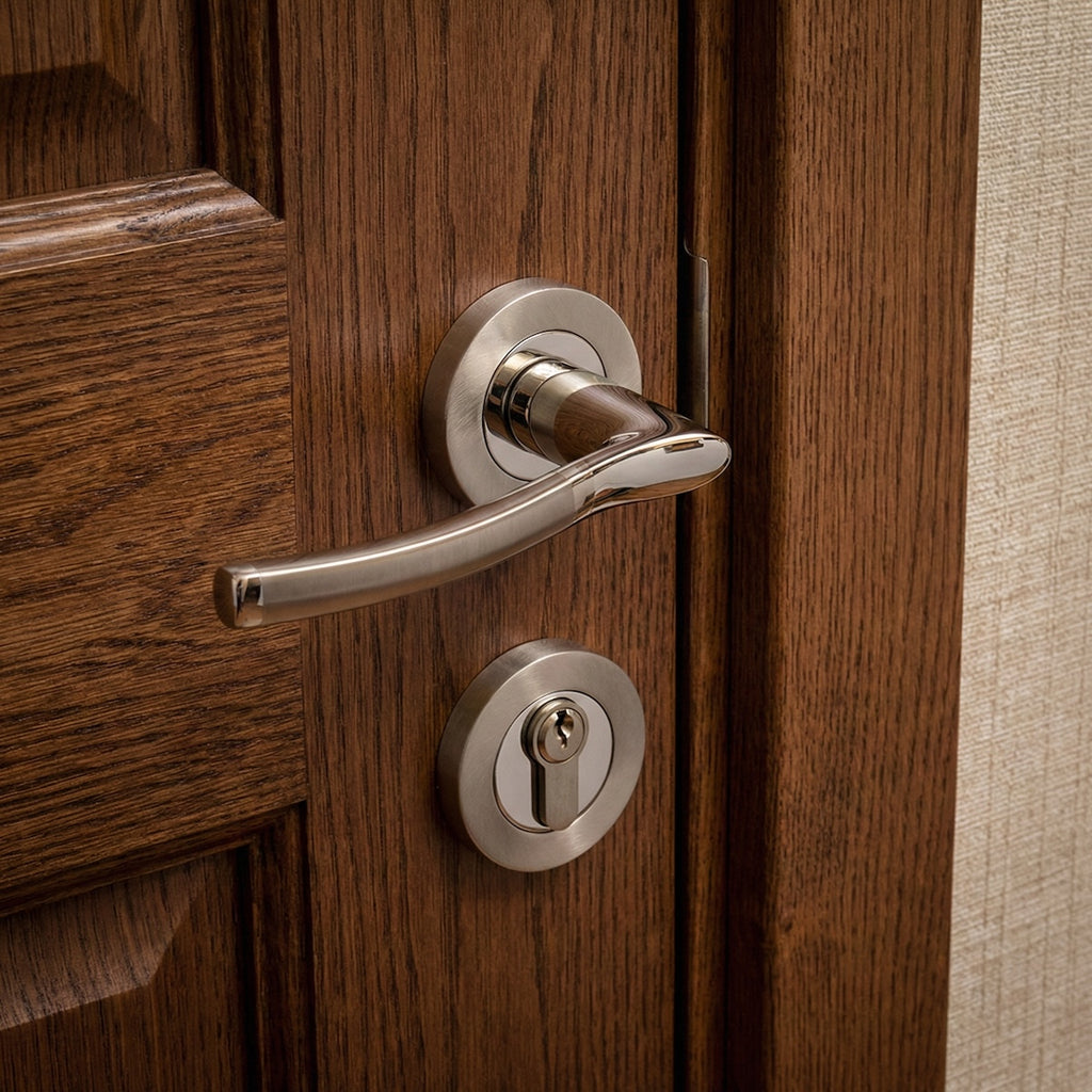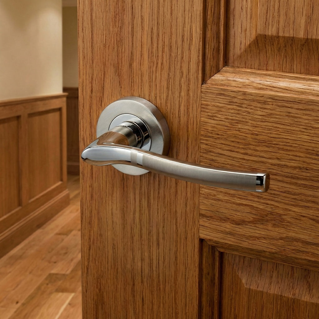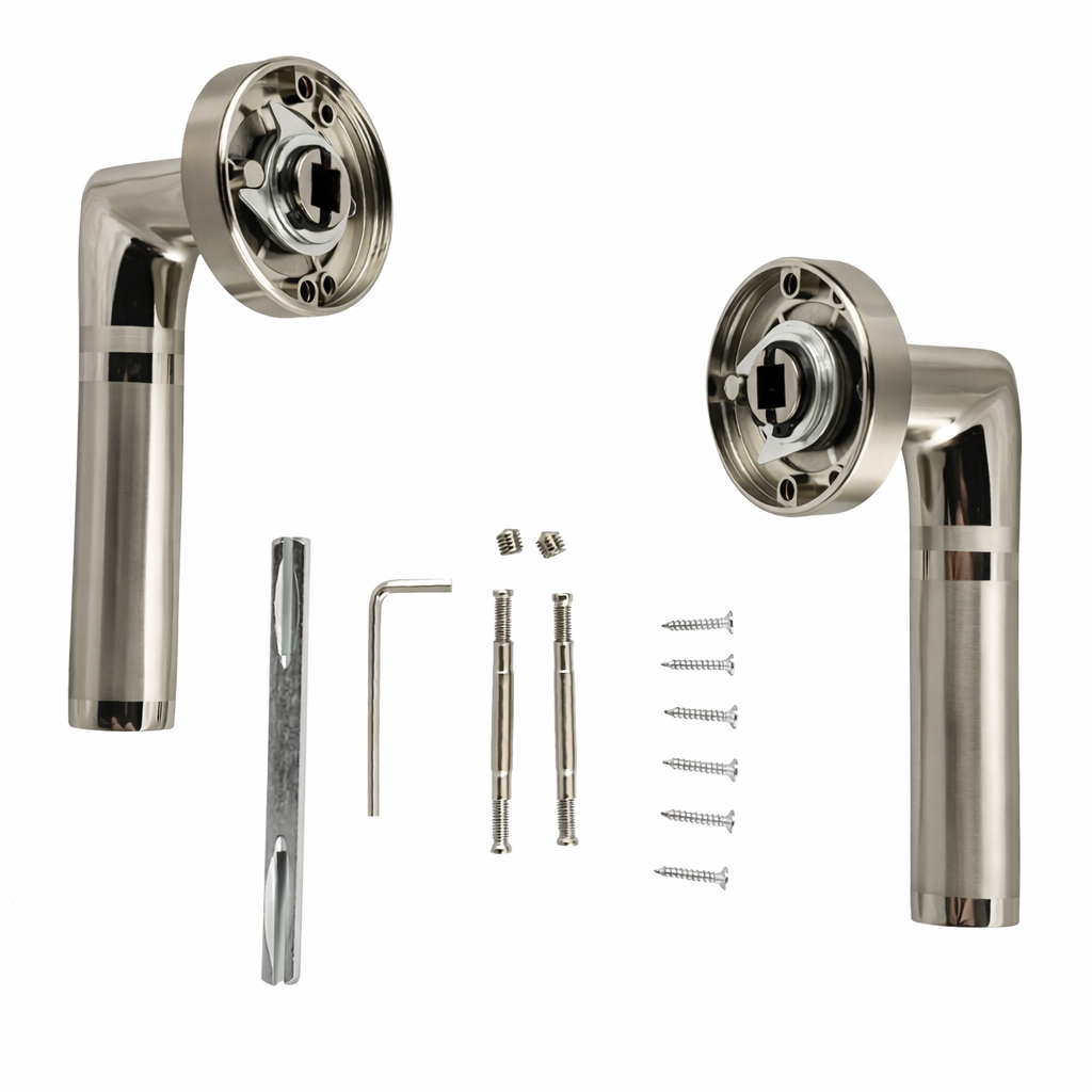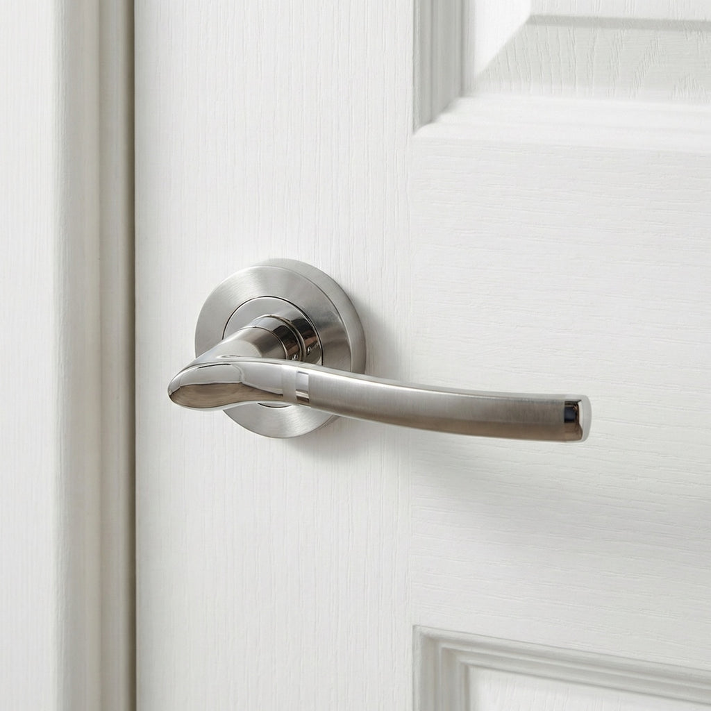 Juego de manillas (2 manillas para una puerta) Dana para puertas con roseta redonda de aluminio y en acabado níquel combinado, ideal para puertas de paso y puertas de entrada. Esta manilla tiene una linea vanguardista y estilista que le da un toque moderno a tu puerta. Es ideal para puertas de interior con baja frecuencia de paso. Su diseño fino y curvado facilitan agarrar mejor el asa y sus acabados de cromo brillo mezclados con níquel satinado combinan a la perfección en cualquier puerta de madera.