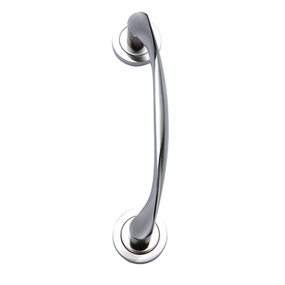Manillón ola de aluminio con roseta redonda en acabado níquel satinado con 200mm entre ejes ideal para puertas de interior y puertas correderas. Este manillón sigue una linea vanguardista y moderna capaz de aportar luz y estética a los lugares en que se instale. Además, viene con todos los accesorios necesarios para su instalación.