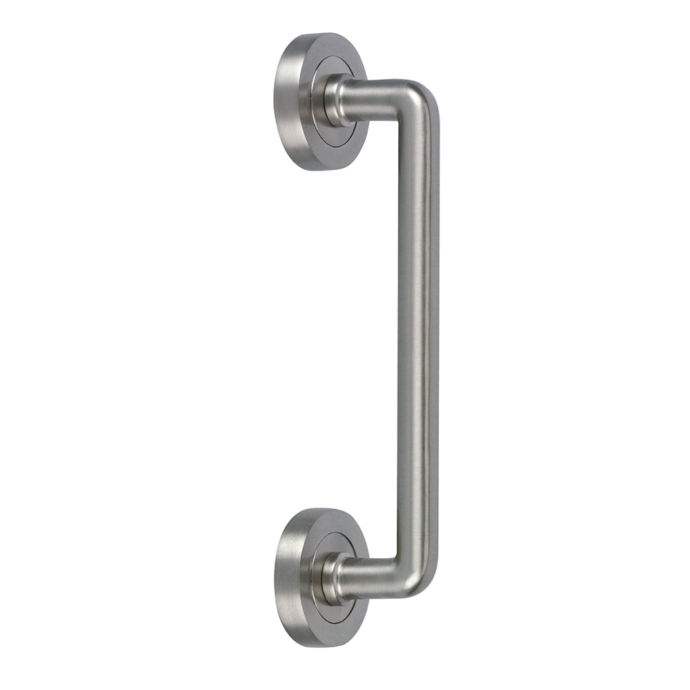 Manillón de zamak con roseta redonda en acabado níquel satinado con 170mm de distancia entre ejes ideal para tus puertas correderas y puertas de entrada. Este manillón de diseño moderno es ideal para conjuntar en cualquiera de tus puertas. Además, viene con los accesorios de instalación necesarios.